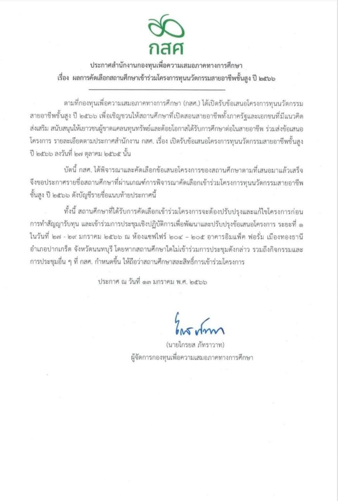 กองทุนเพื่อความเสมอภาคทางการศึกษา (กสศ.) ประกาศผลการคัดเลือกสถานศึกษาเข้าร่วมโครงการทุนนวัตกรรมสายอาชีพชั้นสูง ปี 2566