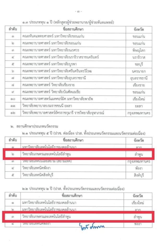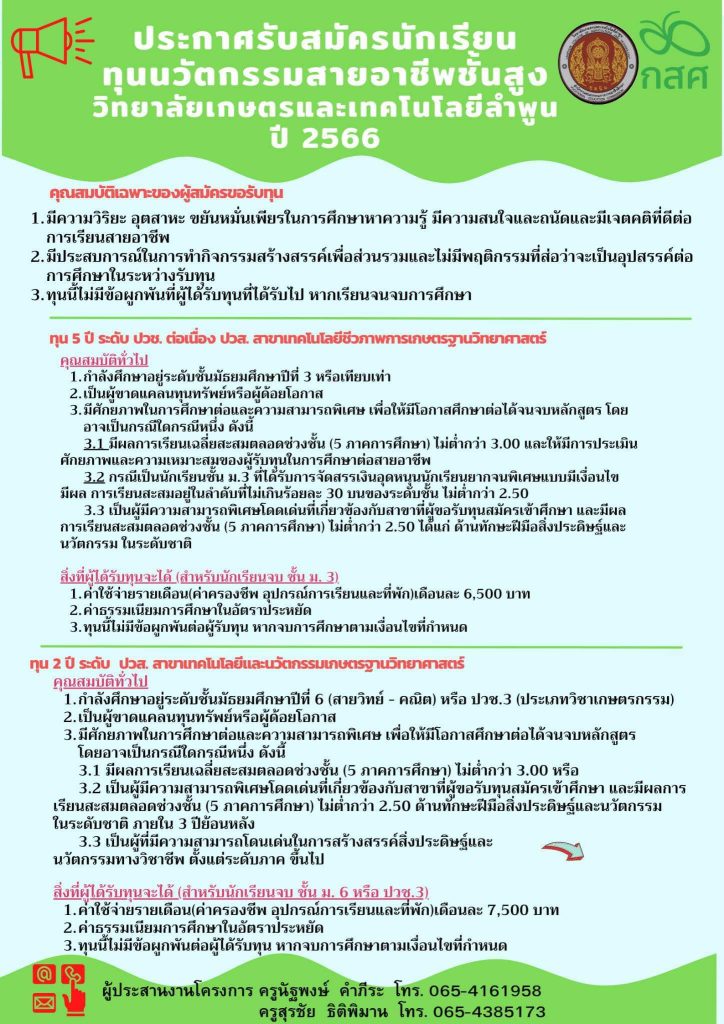 กองทุนเพื่อความเสมอภาคทางการศึกษา (กสศ.) ประกาศผลการคัดเลือกสถานศึกษาเข้าร่วมโครงการทุนนวัตกรรมสายอาชีพชั้นสูง ปี 2566 วิทยาลัยเกษตรและเทคโนโลยีลำพูน ได้รับการคัดเลือก และผ่านเกณฑ์การพิจารณาเข้าร่วมโครงการทั้ง 2 ประเภททุน ได้แก่