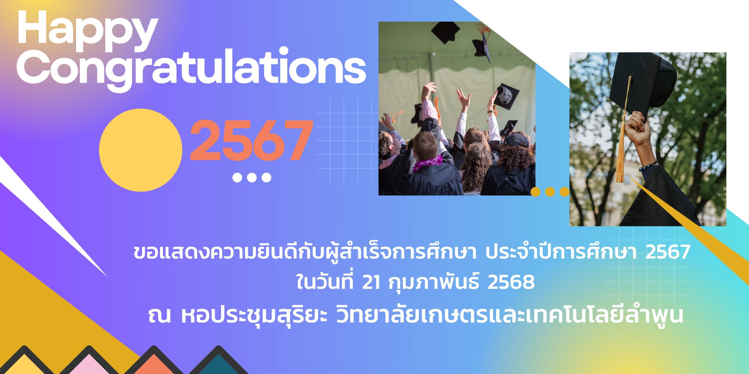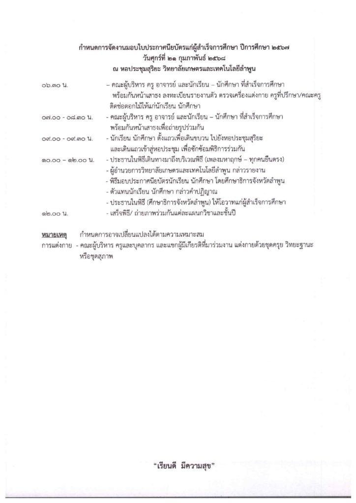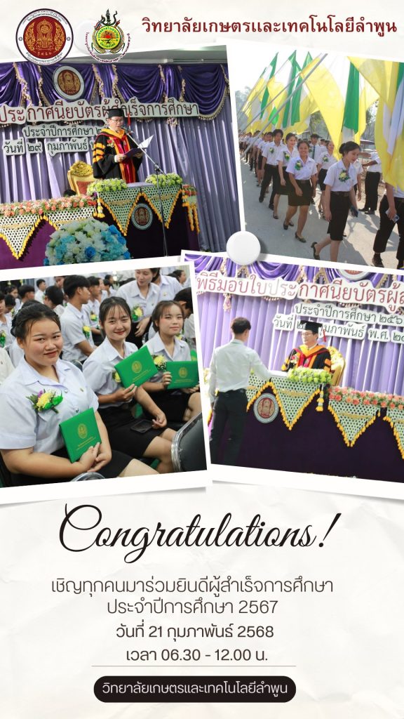 ขอเชิญชวน ร่วมพิธีมอบใบประกาศนียบัตรแก่ผู้สำเร็จการศึกษา ปีการศึกษา 2567 ในวันที่ 21 กุมภาพันธ์ 2568 ณ หอประชุมสุริยะ วิทยาลัยเกษตรและเทคโนโลยีลำพูน