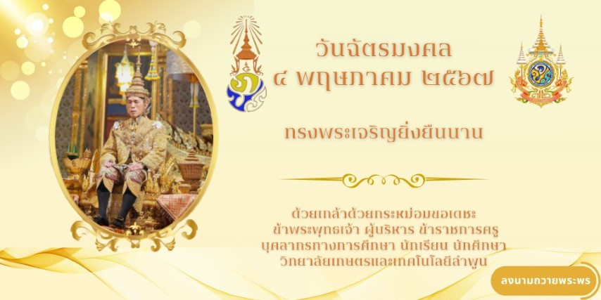 พระบาทสมเด็จพระปรเมนทรรามาธิบดีศรีสินทรมหาวชิราลงกรณ พระวชิรเกล้าเจ้าอยู่หัวเนื่องในโอกาส วันฉัตรมงคล วันที่ ๔ พฤษภาคม ๒๕๖๗ ผ่านระบบออนไลน์ขอเชิญชวน ข้าราชการ บุคลากรกระทรวงศึกษาธิการและประชาชนร่วมลงนามถวายพระพรพระบาทสมเด็จพระปรเมนทรรามาธิบดีศรีสินทรมหาวชิราลงกรณ พระวชิรเกล้าเจ้าอยู่หัวเนื่องในโอกาส #วันฉัตรมงคล วันที่ ๔ พฤษภาคม ๒๕๖๗ ผ่านระบบออนไลน์ที่เว็บไซต์กระทรวงศึกษาธิการ หรือผ่านหน้าเว็บไซต์วิทยาลัยเกษตรและเทคโนโลยีลำพูน ระหว่างวันที่ ๑ – ๓๑ พฤษภาคม ๒๕๖๗