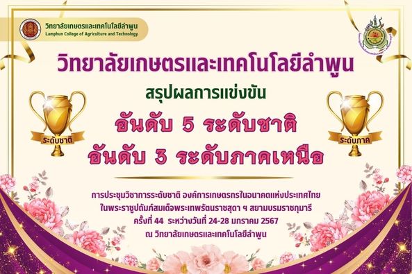 สรุปผลการแข่งขัน การสัมมนาทางวิชาการ การประกวด การแสดง และการแข่งขันทักษะวิชาชีพ การประชุมวิชาการระดับชาติ องค์การเกษตรกรในอนาคตแห่งประเทศไทยในพระราชูปถัมภ์สมเด็จพระเทพรัตนราชสุดา ฯ สยามบรมราชกุมารี ครั้งที่ 44 ระหว่างวันที่ 24-28 มกราคม 2567 ณ วิทยาลัยเกษตรและเทคโนโลยีลำพูน