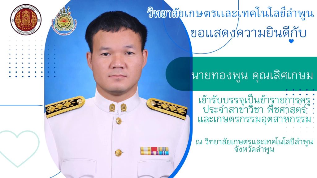 วันที่ 26 เมษายน 2566 นางสาวสุภัคคณิศร รุ่งเรือง ผู้อำนวยการวิทยาลัยเกษตรและเทคโนโลยีลำพูน คณะผู้บริหาร คณะครู และบุคลากรทางการศึกษา ร่วมแสดงความยินดีกับบุคลากรที่ได้รับการบรรจุและแต่งตั้งเป็นข้าราชการครู ตำแหน่งครูผู้ช่วย สังกัดสำนักงานคณะกรรมการการอาชีวศึกษา กระทรวงศึกษาธิการ ณ หอประชุมสุริยะ วิทยาลัยเกษตรและเทคโนโลยีลำพูน
