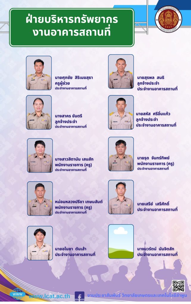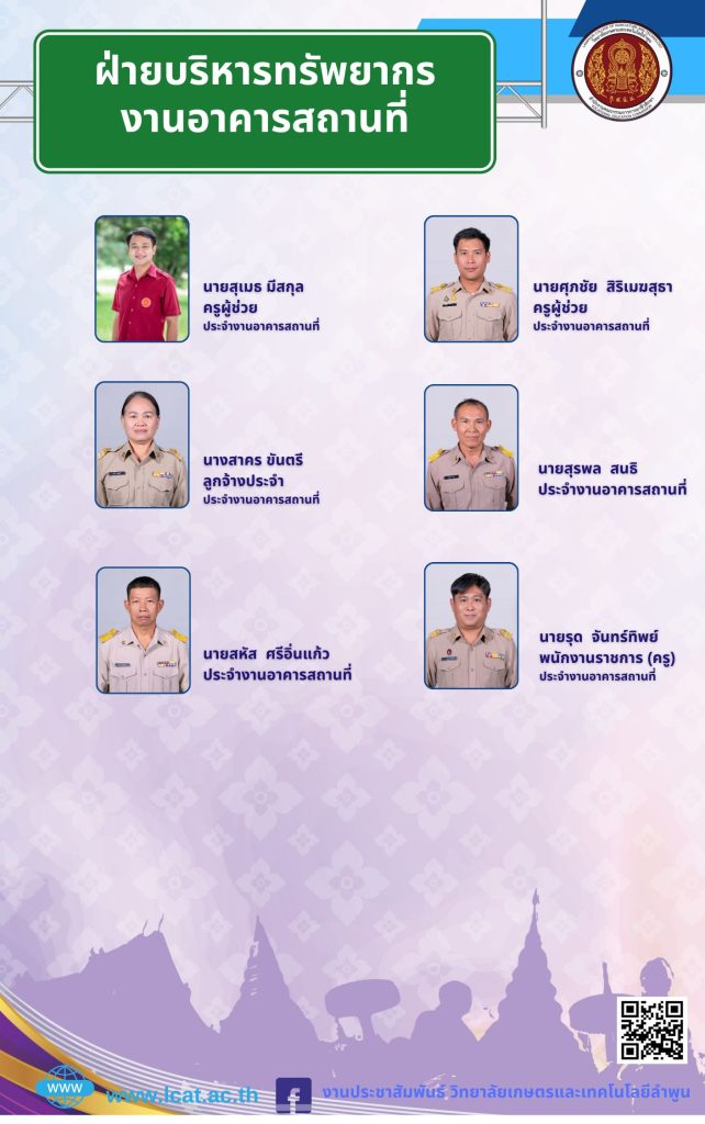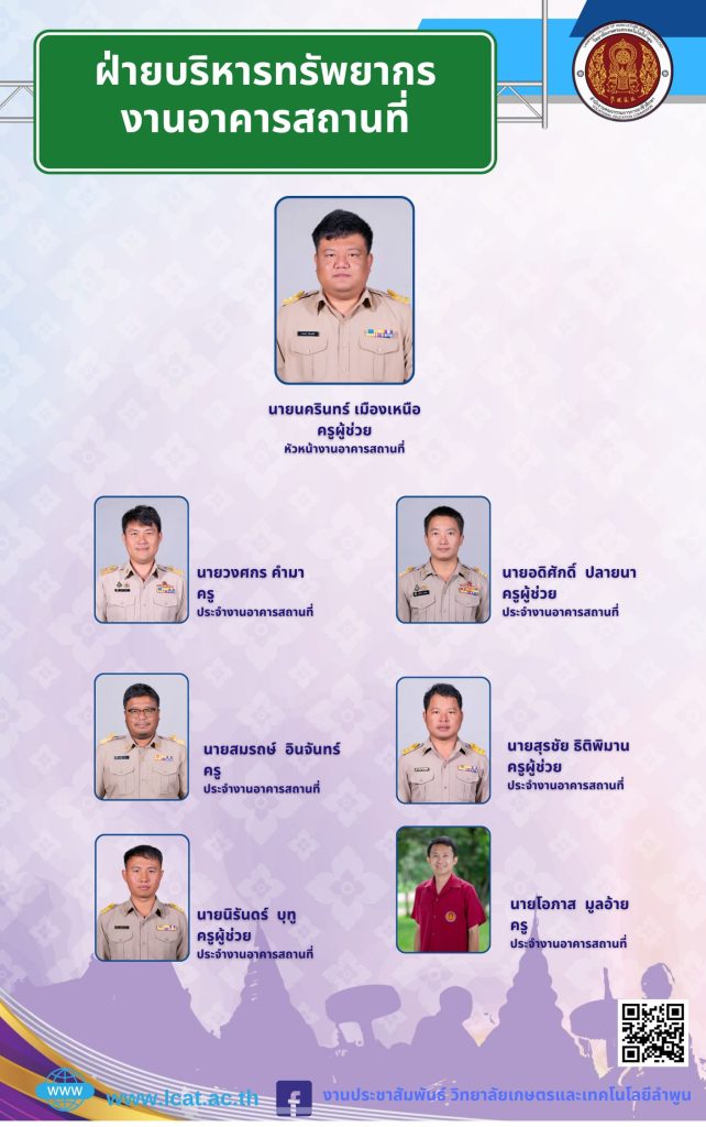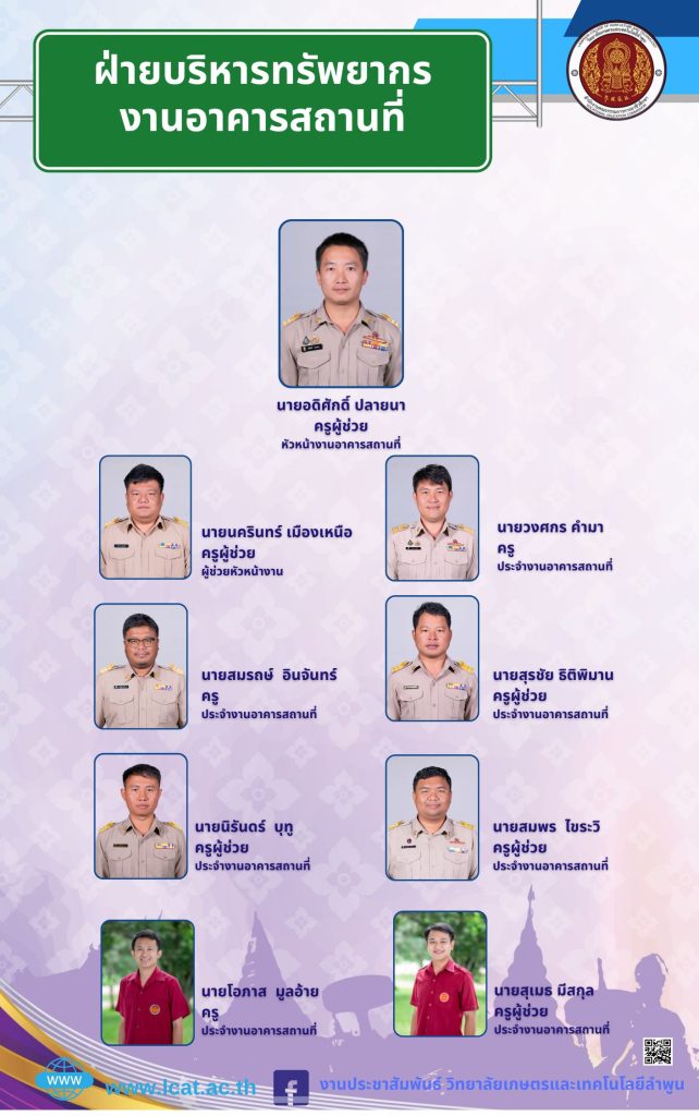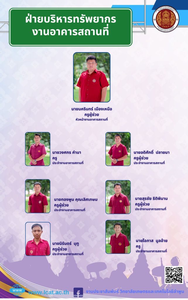 - ควบคุมดูแล ปรับปรุง ซ่อมแซม พัฒนาอาคารสถานที่ การอนุรักษ์พลังงานการรักษาสภาพแวดล้อมและระบบสาธารณูปโภคของสถานศึกษา