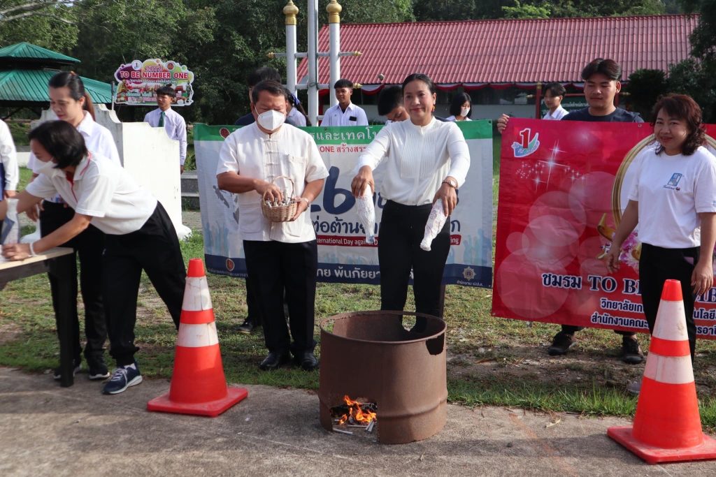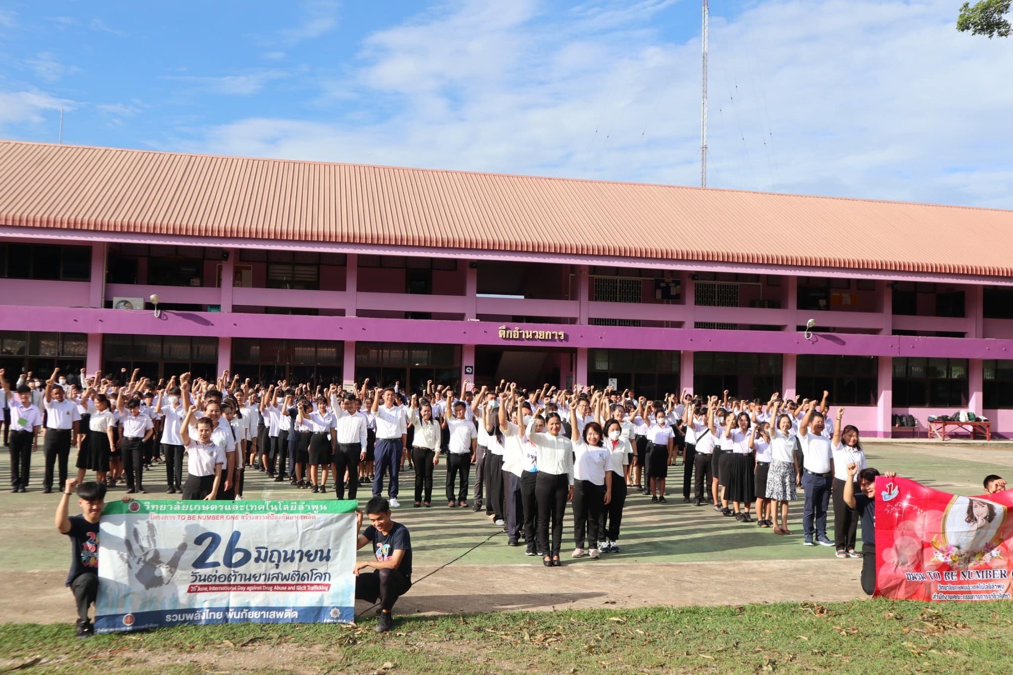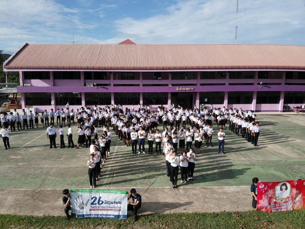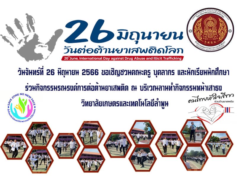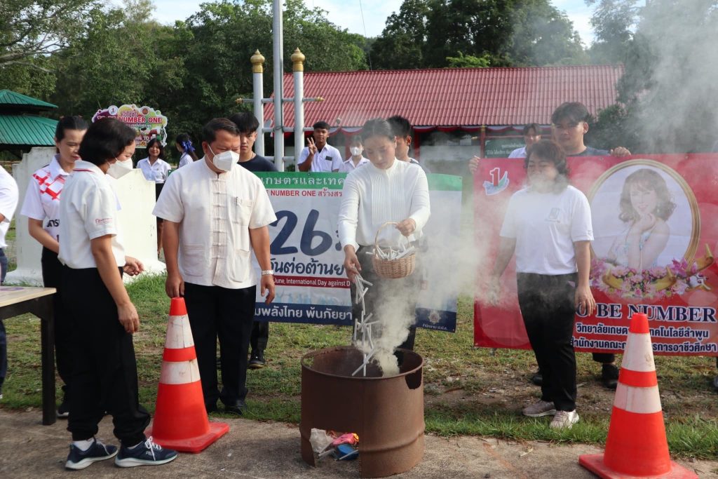 วันที่ 26 มิถุนายน 2566 วิทยาลัยเกษตรและเทคโนโลยีลำพูน จัดกิจกรรมรณรงค์การต่อต้านยาเสพติด นำโดยท่านผู้อำนวยการ นางสาวสุภัคคณิศร รุ่งเรือง อ่านสารรัฐมนตรีว่าการกระทรวงศึกษาธิการและนำกล่าวคำปฏิญาณตนประกาศเจตนารมณ์ต่อต้านยาเสพติด คณะผู้บริหาร คณะครูและบุคลากร และนักเรียน นักศึกษา ร่วมกันแสดงออกเชิงสัญลักษณ์ การเผาทำลายยาเสพติด รวมทั้งการร่วมแปรอักษร ‘ 1 LCAT SAY NO X’ ณ บริเวณลานทำกิจกรรมหน้าเสาธง วิทยาลัยเกษตรและเทคโนโลยีลำพูน