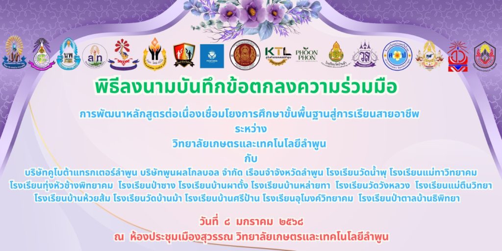 วันที่ 8 มกราคม 2568 เวลา 09.30 น.วิทยาลัยเกษตรและเทคโนโลยีลำพูน ได้จัดพิธีลงนามบันทึกข้อตกลงความร่วมมือ การพัฒนาหลักสูตรต่อเนื่องเชื่อมโยงการศึกษาขั้นพื้นฐานสู่การเรียนสายอาชีพ ระหว่างวิทยาลัยเกษตรและเทคโนโลยีลำพูน ร่วมกับ บริษัท คูโบต้าแทรคเตอร์ลำพูน จำกัด, บริษัทพูลผลโกลบอล จำกัด, เรือนจำจังหวัดลำพูน, โรงเรียนวัดน้ำพุ, โรงเรียนแม่ทาวิทยาคม, โรงเรียนทุ่งหัวช้างพิทยาคม, โรงเรียนป่าซาง, โรงเรียนบ้านผาตั้ง, โรงเรียนบ้านหล่ายทา, โรงเรียนวัดวังหลวง, โรงเรียนแม่ตืนวิทยา, โรงเรียนบ้านห้วยส้ม, โรงเรียนวัดบ้านม้า, โรงเรียนบ้านศรีป้าน, โรงเรียนอุโมงวิทยาคม, โรงเรียนป่าตาลบ้านธิพิทยา โดยมีนางภัทรานิษฐ์ พัชริศวโรจน์ รองผู้อำนวยการฝ่ายแผนงานและความร่วมมือ เป็นประธานกล่าวเปิดพิธีฯ ณ ห้องประชุมเมืองสุวรรณ วิทยาลัยเกษตรและเทคโนโลยีลำพูน
