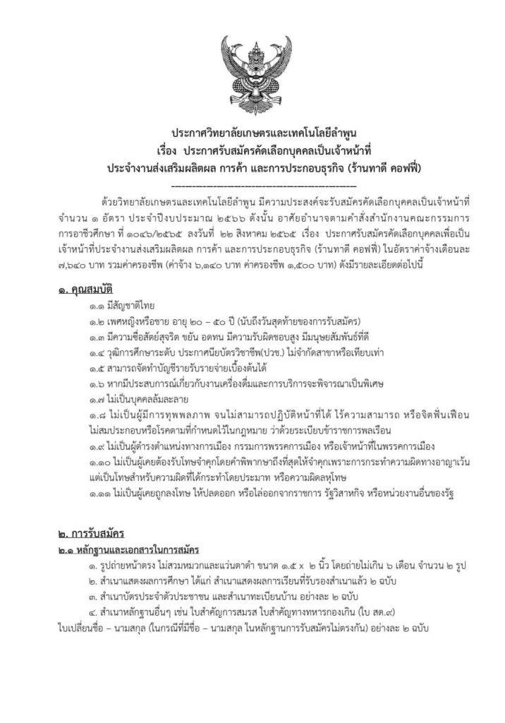 ประกาศวิทยาลัยเกษตรและเทคโนโลยีลำพูน เรื่อง ประกาศรับสมัครคัดเลือกบุคคลเป็นเจ้าหน้าที่ประจำงานส่งเสริมผลิตผล การค้า และการประกอบธุรกิจ (ร้านทาดี คอฟฟี่)