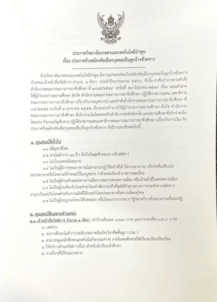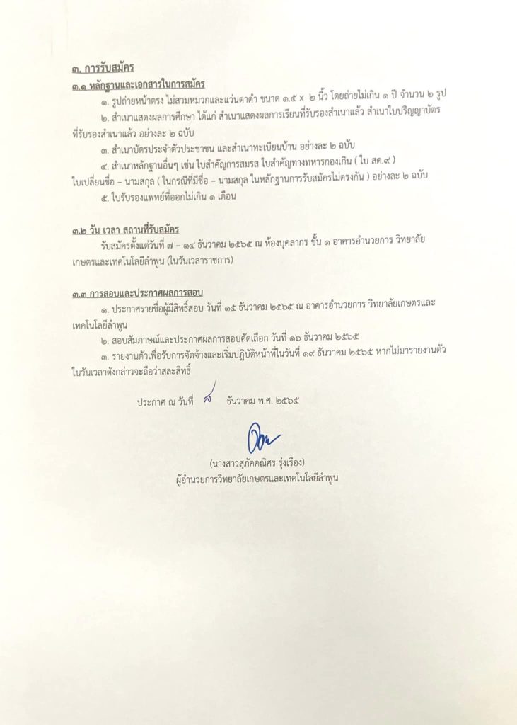 ประกาศวิทยาลัยเกษตรและเทคโนโลยีลำพูน เรื่องประกาศรับสมัครตำแหน่งเจ้าหน้าที่สวัสดิการ จำนวน 1 อัตรา