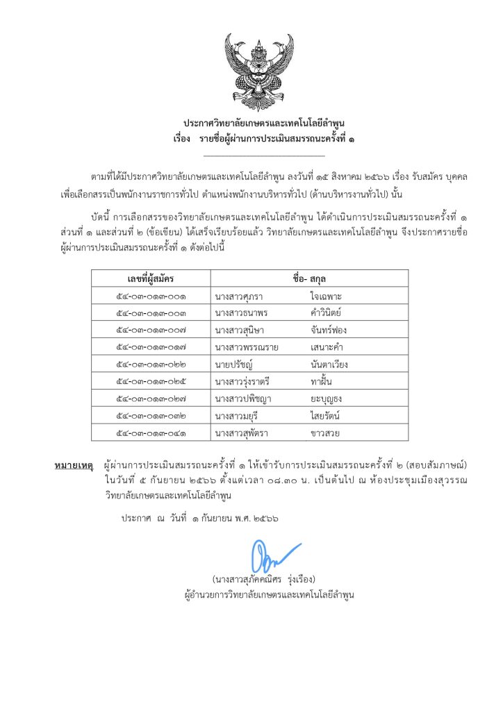 ประกาศวิทยาลัยเกษตรและเทคโนโลยีลำพูน เรื่องรายชื่อผู้ผ่านการประเมินสมรรถนะครั้งที่ 1 ตาม ที่วิทยาลัยได้มีประกาศลงวันที่ 15 สิงหาคม 2566 เรื่องรับสมัครบุคคลเพื่อเลือกสรรเป็นพนักงานราชการทั่วไป(ตำแหน่งพนักงานบริหารงานทั่วไป)นั้น จึงประกาศรายชื่อผู้ผ่านการประเมินครั้งที่ 1 ดังนี้