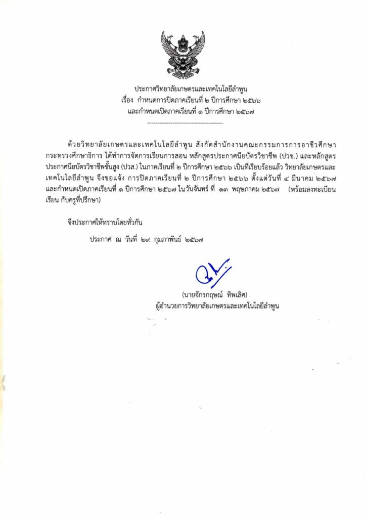 ประกาศวิทยาลัยเกษตรและเทคโนโลยีลำพูน เรื่องกำหนดการปิดภาคเรียนที่ 2 ปีการศึกษา 2566 และกำหนดเปิดภาคเรียนที่ 1 ปีการศึกษา 2567