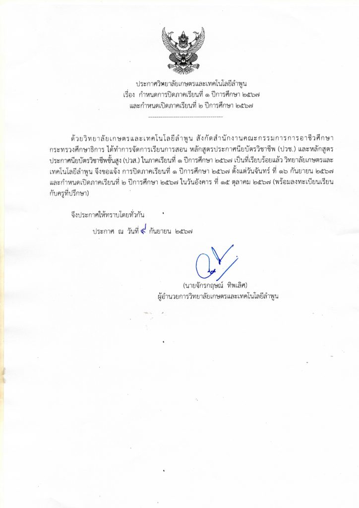 ประกาศวิทยาลัยเกษตรและเทคโนโลยีลำพูน เรื่องกำหนดการปิดภาคเรียนที่ 1 ปีการศึกษา 2567 และกำหนดเปิดภาคเรียนที่ 2 ปีการศึกษา 2567