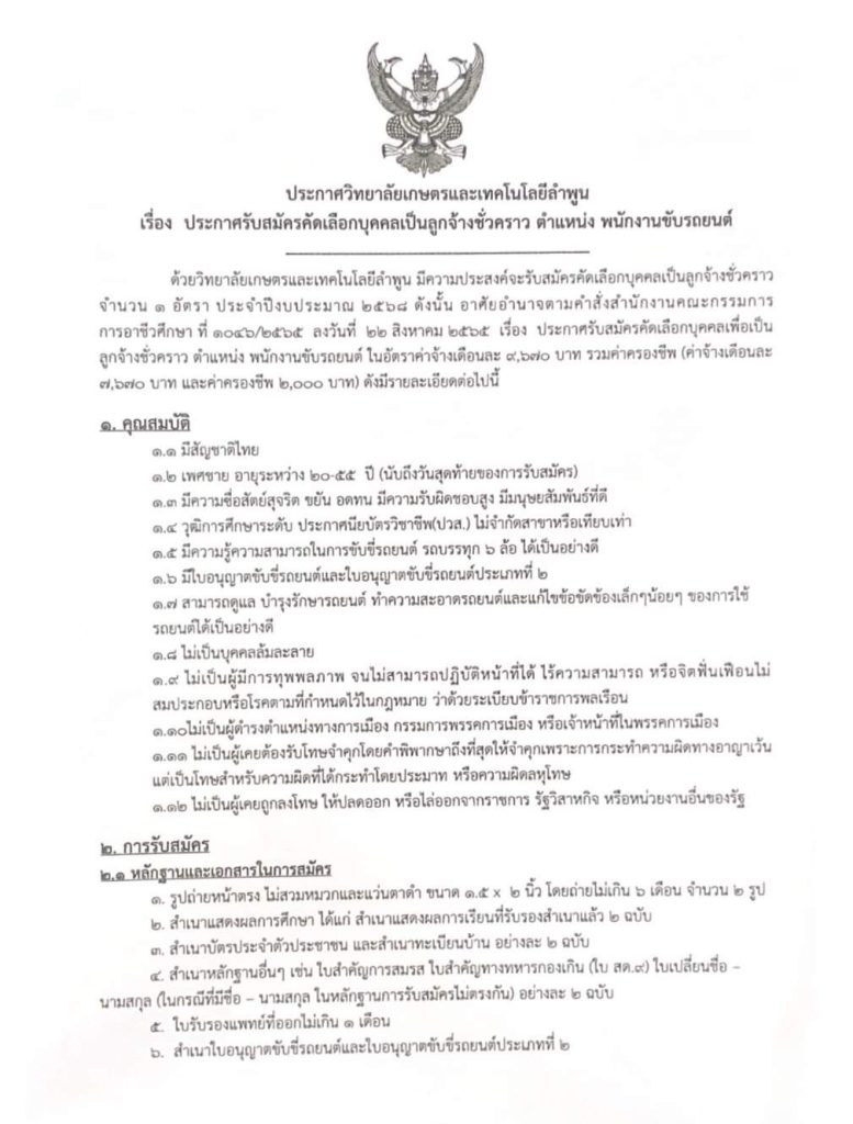 ประกาศวิทยาลัยเกษตรและเทคโนโลยีลำพูน เรื่องรับสมัครคัดเลือกบุคคลเป็นลูกจ้างชั่วคราว ตำแหน่งพนักงานขับรถยนต์ จำนวน 1 อัตรา