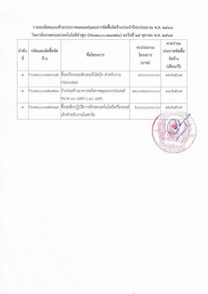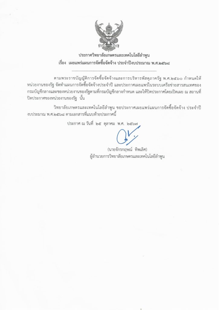 ประกาศ วิทยาลัยเกษตรและเทคโนโลยีลำพูน เรื่องเผยแพร่แผนการจัดซื้อจัดจ้างประจำปีงบประมาณ พ.ศ 2558 จำนวน 3 รายการ