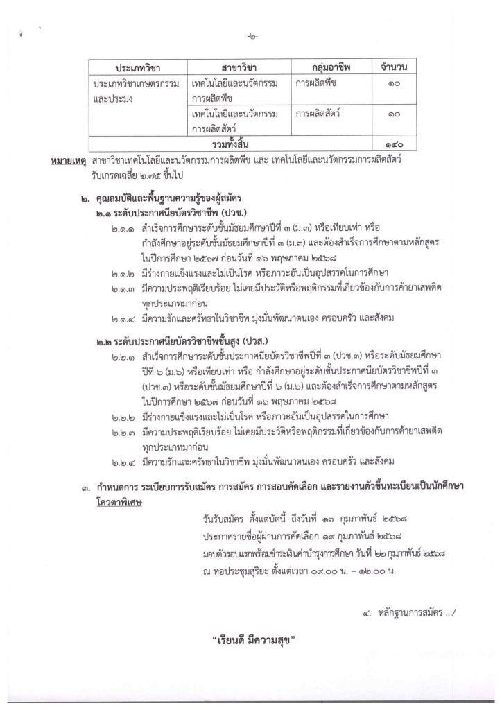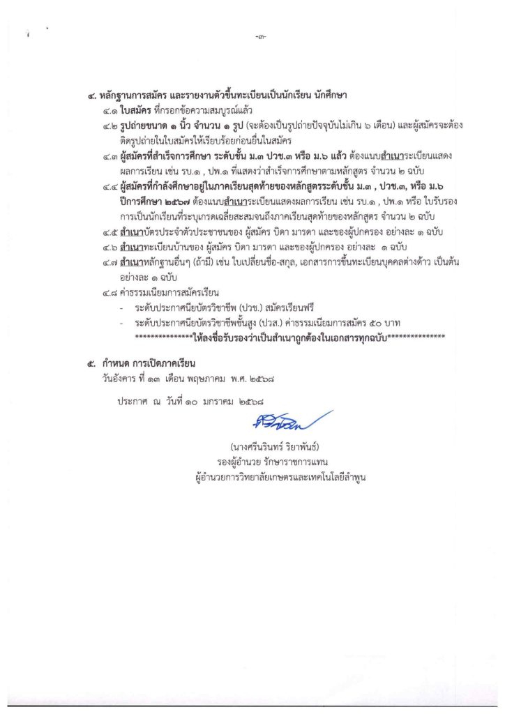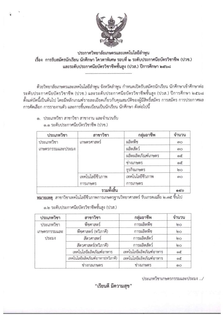 ประกาศวิทยาลัยเกษตรและเทคโนโลยีลำพูน เปิดรับสมัครนักเรียน นักศึกษาใหม่ ประจำปีการศึกษา 2568 (รอบโควตาพิเศษ รอบที่ 2)