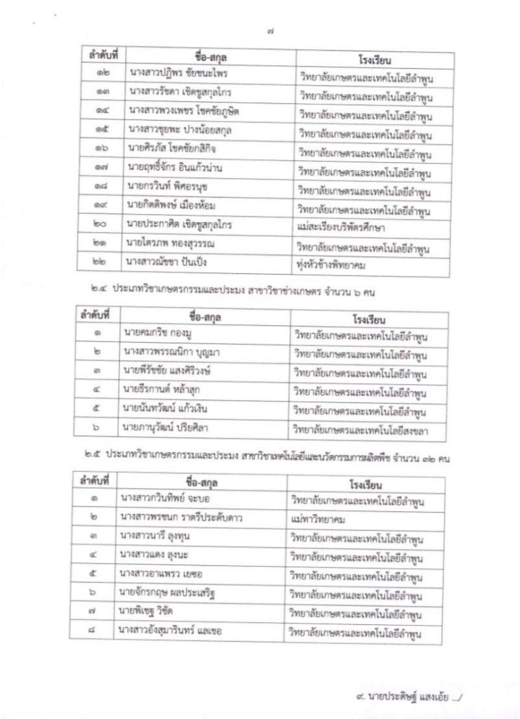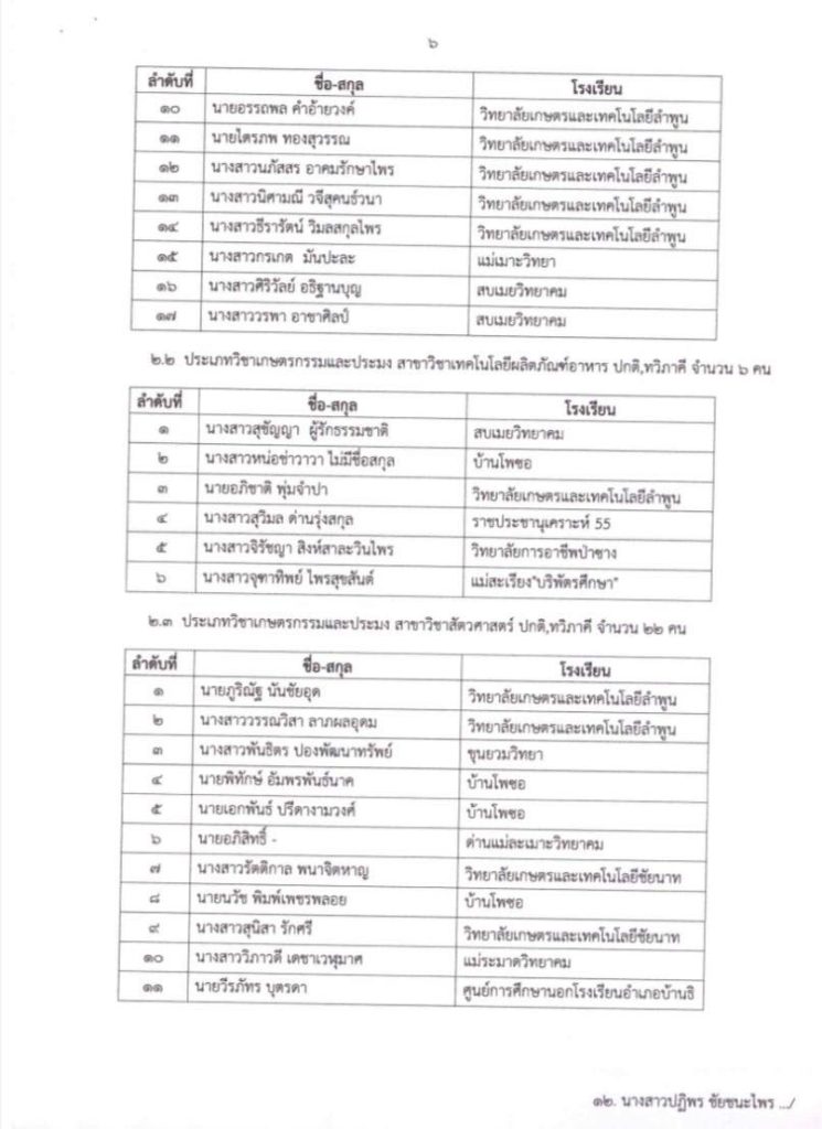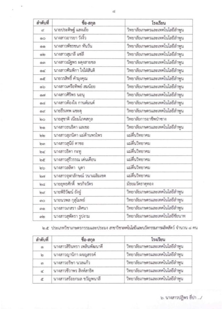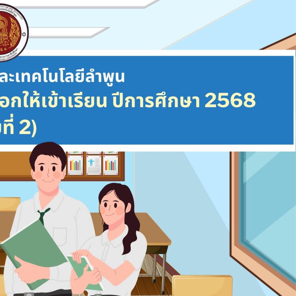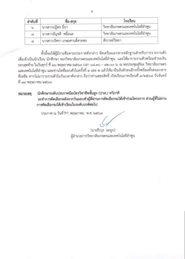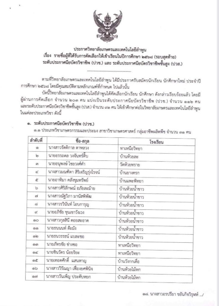 ประกาศวิทยาลัยเกษตรและเทคโนโลยีลำพูน เรื่อง รายชื่อผู้ที่ได้รับการคัดเลือกให้เข้าเรียนในปีการศึกษา 2568 (รอบสุดท้าย) ระดับประกาศนียบัตรวิชาชีพ (ปวช.)