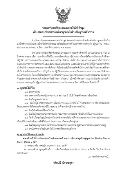 ประกาศวิทยาลัยเกษตรและเทคโนโลยีลำพูน เรื่อง ประกาศรับสมัครคัดเลือกบุคคลเพื่อจ้างเป็นลูกจ้างชั่วคราว ตำแหน่ง เจ้าที่ประจำงานส่งเสริมผลิตผลการค้าและการประกอบธุรกิจ (ผู้ดูแลร้าน Thadee Risotto Cafe) จำนวน 1 อัตรา
