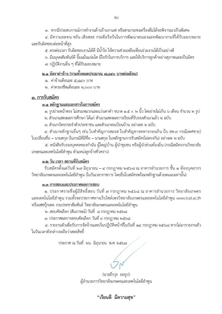ประกาศวิทยาลัยเกษตรและเทคโนโลยีลำพูน เรื่อง ประกาศรับสมัครคัดเลือกบุคคลเพื่อจ้างเป็นลูกจ้างชั่วคราว ตำแหน่ง เจ้าที่ประจำงานส่งเสริมผลิตผลการค้าและการประกอบธุรกิจ (ผู้ดูแลร้าน Thadee Risotto Cafe) จำนวน 1 อัตรา ประจำปีงบประมาณ พ.ศ. 2568