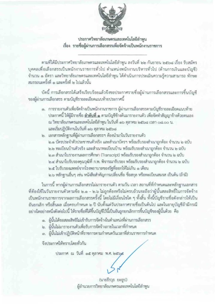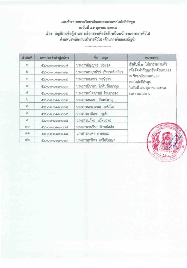 ประกาศ รายชื่อผู้ผ่านการคัดเลือกเพื่อจัดจ้างเป็นพนักงานราชการทั่วไป ตำแหน่งพนักงานทั่วไป(ด้านการเงินและบัญชี)