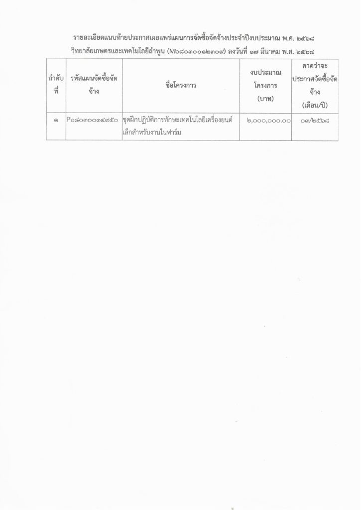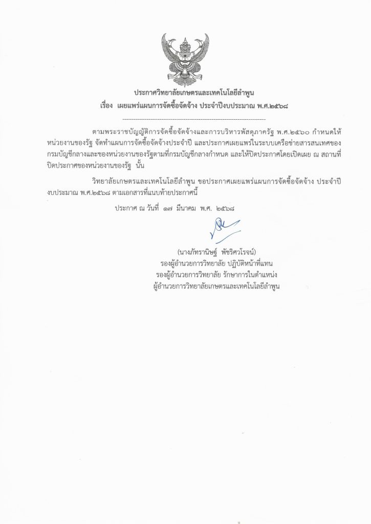 ประกาศ วิทยาลัยเกษตรและเทคโนโลยีลำพูน เรื่องเผยแพร่แผนการจัดซื้อจัดจ้างประจำปีงบประมาณ พ.ศ 2558 จำนวน 1 รายการ