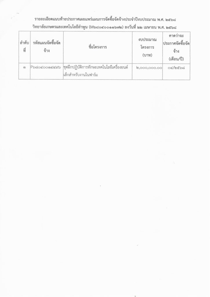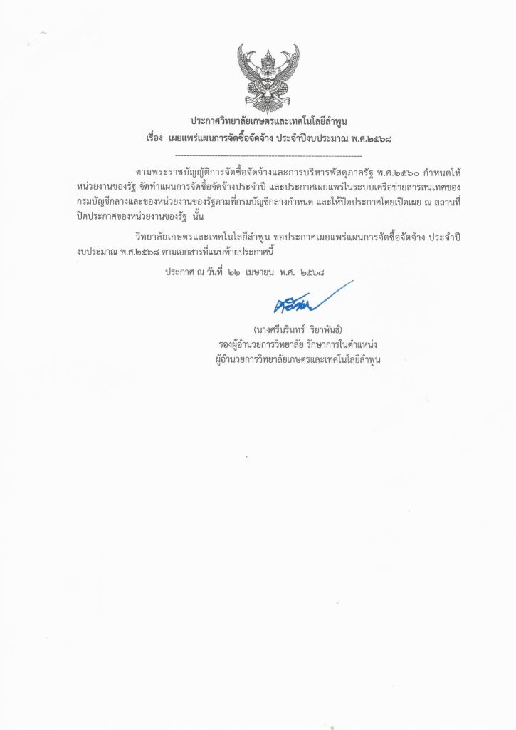 ประกาศ วิทยาลัยเกษตรและเทคโนโลยีลำพูน เรื่องเผยแพร่แผนการจัดซื้อจัดจ้างประจำปีงบประมาณ พ.ศ 2558 จำนวน 1 รายการ
