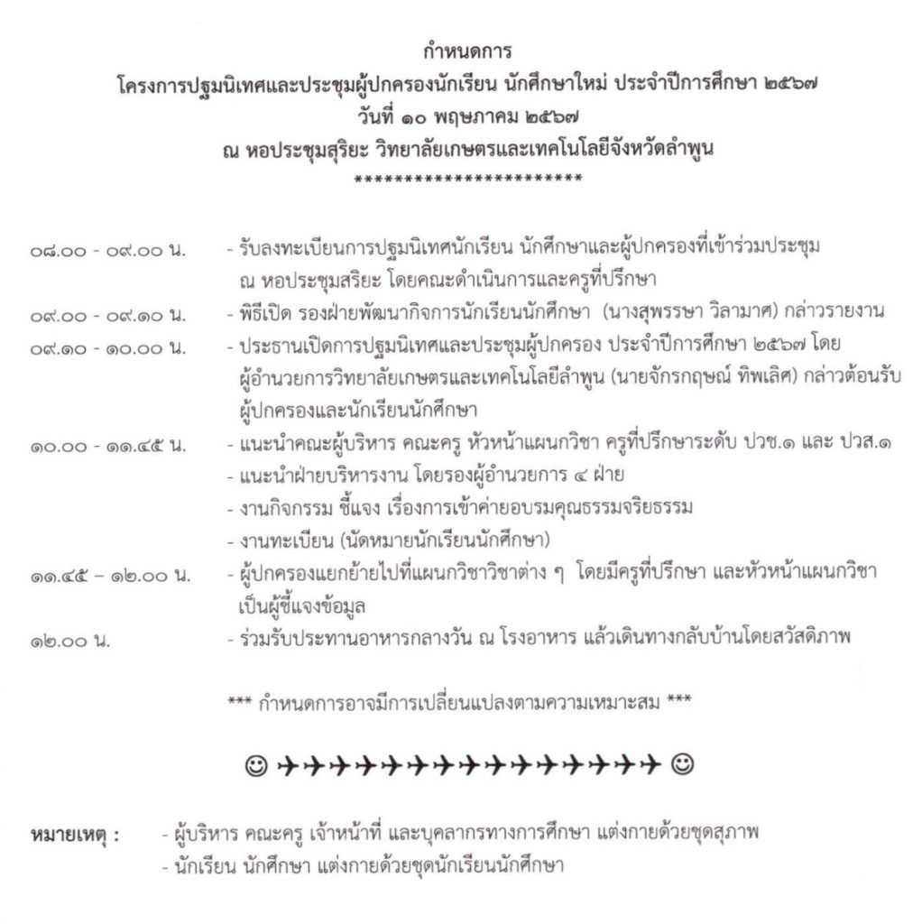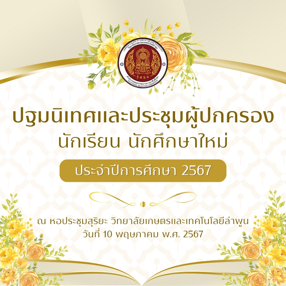 ประกาศ วิทยาลัยเกษตรและเทคโนโลยีลำพูน กำหนดปฐมนิเทศและประชุมผู้ปกครองนักเรียน นักศึกษาใหม่ ประจำปีการศึกษา 2567 วันศุกร์ที่ 10 พฤษภาคม 2567 เวลา 08.00 – 12.00 น ณ หอประชุมสุริยะ วิทยาลัยเกษตรและเทคโนโลยีลำพูน