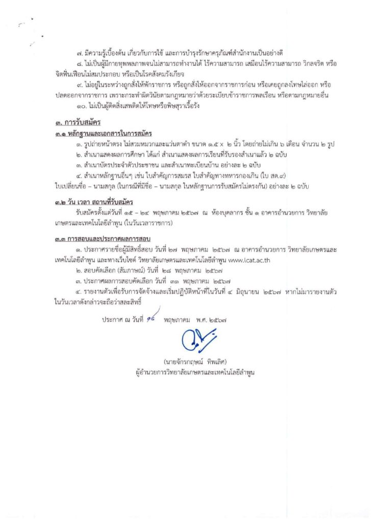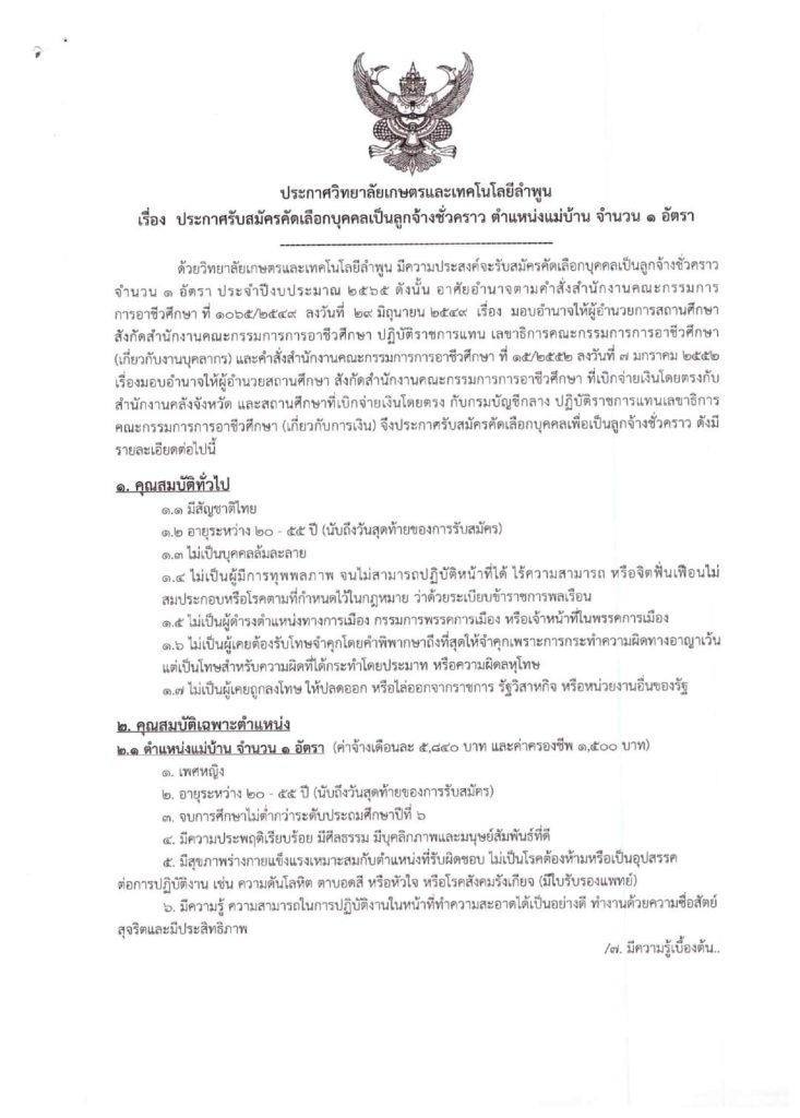 ประกาศ วิทยาลัยเกษตรและเทคโนโลยีลำพูน รับสมัครคัดเลือกบุคคลเป็นลูกจ้างชั่วคราว ตำแหน่งแม่บ้าน จำนวน 1 อัตรา