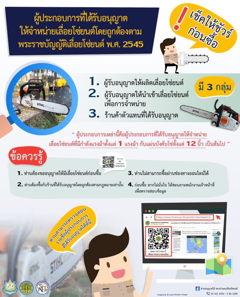 ประกาศ สามารถตรวจสอบข้อมูลผู้ประกอบการที่ได้รับอนุญาตให้จำหน่ายเลื่อยโซ่ยนต์โดยถูกต้องตามพระราชบัญญัติเลื่อยโซ่ยนต์ พ.ศ. 2545