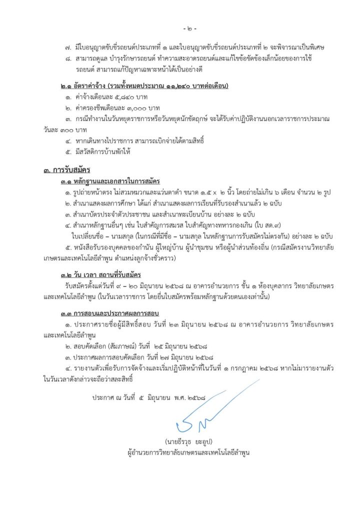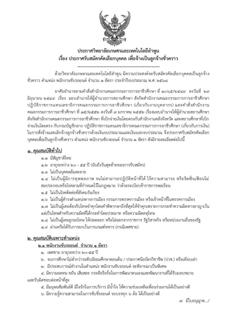 ตำแหน่ง พนักงานขับรถยนต์ จำนวน 1 อัตรา ประจำปีงบประมาณ พ.ศ. 2568 รับสมัครตั้งแต่วันที่ 9 – 20 มิถุนายน 2568 ณ อาคารอำนวยการ ชั้น 1 ห้องบุคลากร วิทยาลัยเกษตรและเทคโนโลยีลำพูน (ในวันเวลาราชการ โดยยื่นใบสมัครพร้อมหลักฐานด้วยตนเองเท่านั้น)