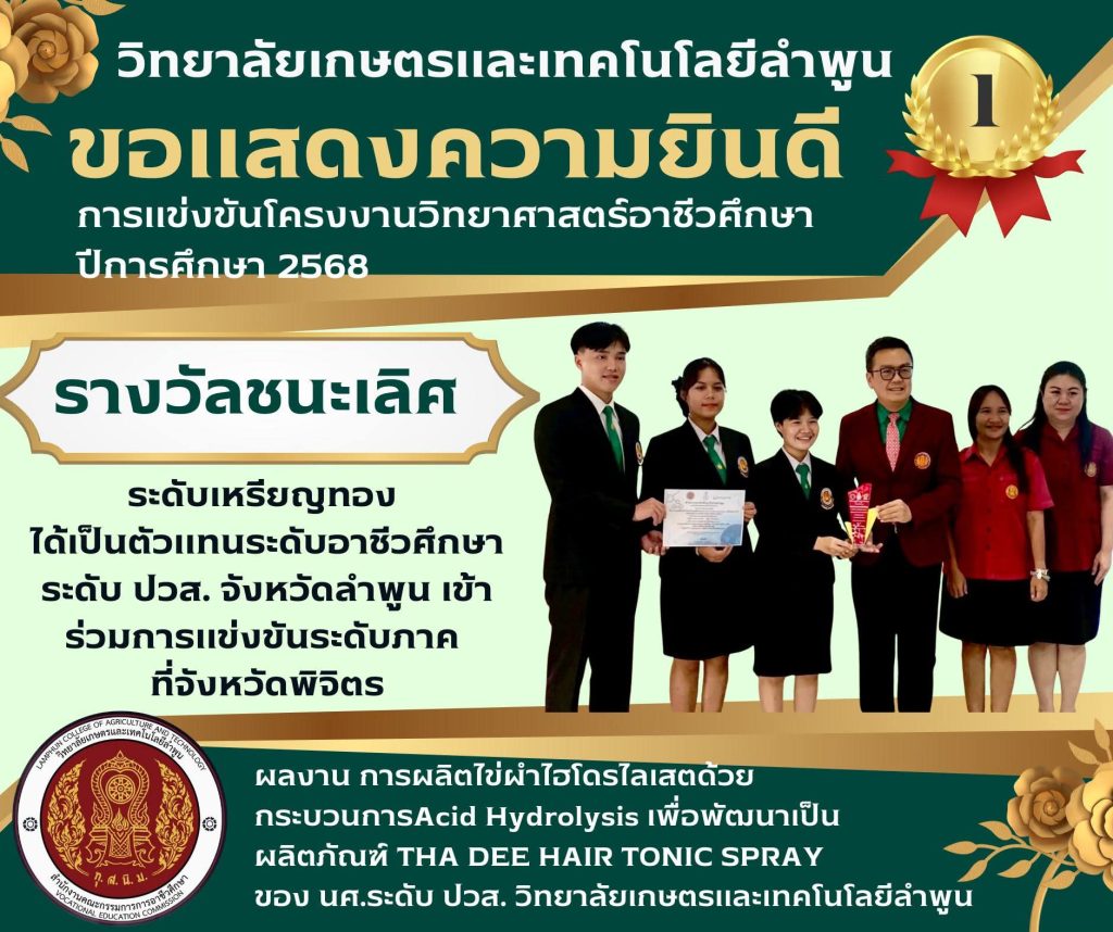 ผลการแข่งขันโครงงานวิทยาศาสตร์ ระดับปวส เรื่องการผลิตไข่ผำไฮโดรไลเสตด้วยกระบวนการ Acid Hydrolysis เพื่อพัฒนาเป็นผลิตภัณฑ์ THA DEE HAIR TONIC SPRAY ได้รับรางวัลชนะเลิศ ระดับเหรียญทอง และได้เป็นตัวแทนระดับอาชีวศึกษาจังหวัดลำพูน เข้าร่วมการแข่งขันระดับภาค ที่จังหวัดพิจิตร