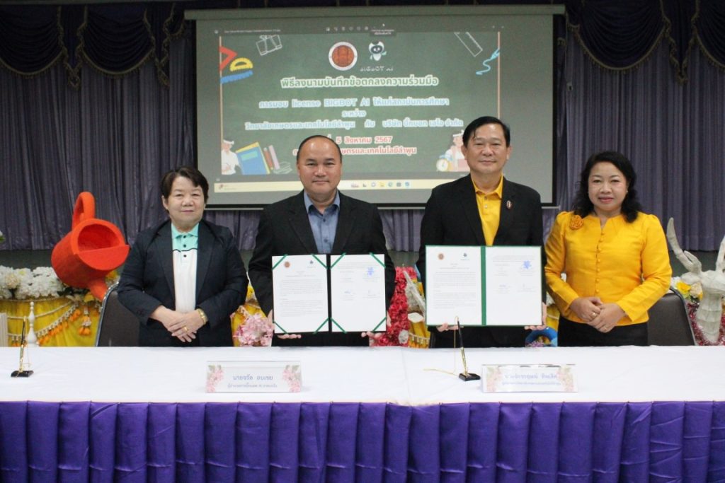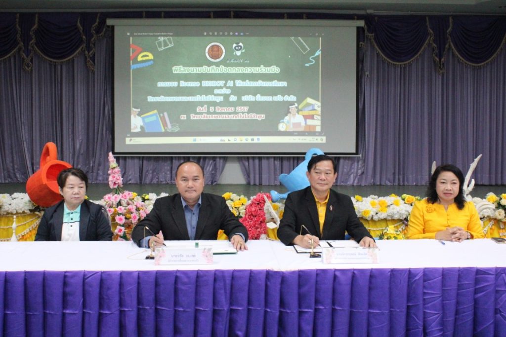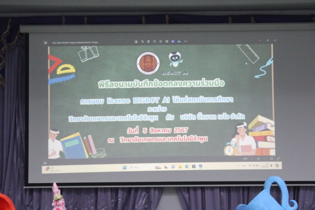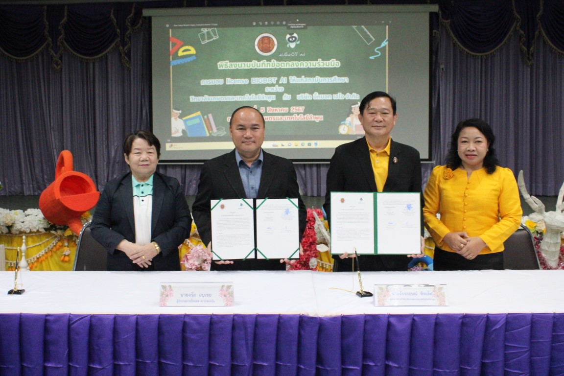 วันที่ 5 สิงหาคม 2567 ดร.จักรกฤษณ์ ทิพเลิศ ผู้อำนวยการวิทยาลัยเกษตรและเทคโนโลยีลำพูน พร้อมด้วยคณะผู้บริหาร ครู บุคลากรทางการศึกษา เข้าร่วมพิธีลงนามบันทึกข้อตกลงความร่วมมือการมอบ license BIGBOT AI ให้แก่สถาบันการศึกษาระหว่างวิทยาลัยเกษตรและเทคโนโลยีลำพูน กับ บริษัท บิ๊กบอท เอไอ จำกัด และเข้ารับการอบรมการใช้งานและนำเทคโนโลยีปัญญาประดิษฐ์ (AI) เพื่อการพัฒนางานวิชาการ สื่อการสอน และวิจัยในยุคดิจิทัล ณ