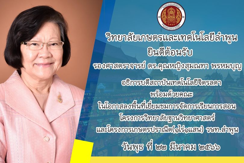 วิทยาลัยเกษตรเเละเทคโนโลยีลำพูน ยินดีต้อนรับอย่างยิ่งในโอกาสที่ท่านรองศาสตราจารย์ ดร.คุณหญิงสุมณฑา พรหมบุญ อธิการบดีสถาบันเทคโนโลยีจิตรลดาพร้อมด้วยคณะ