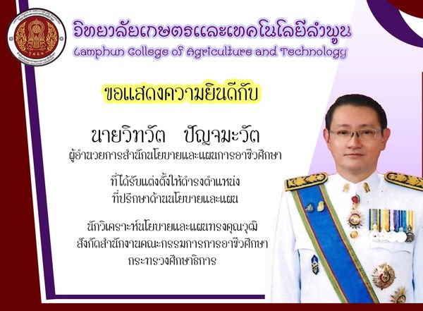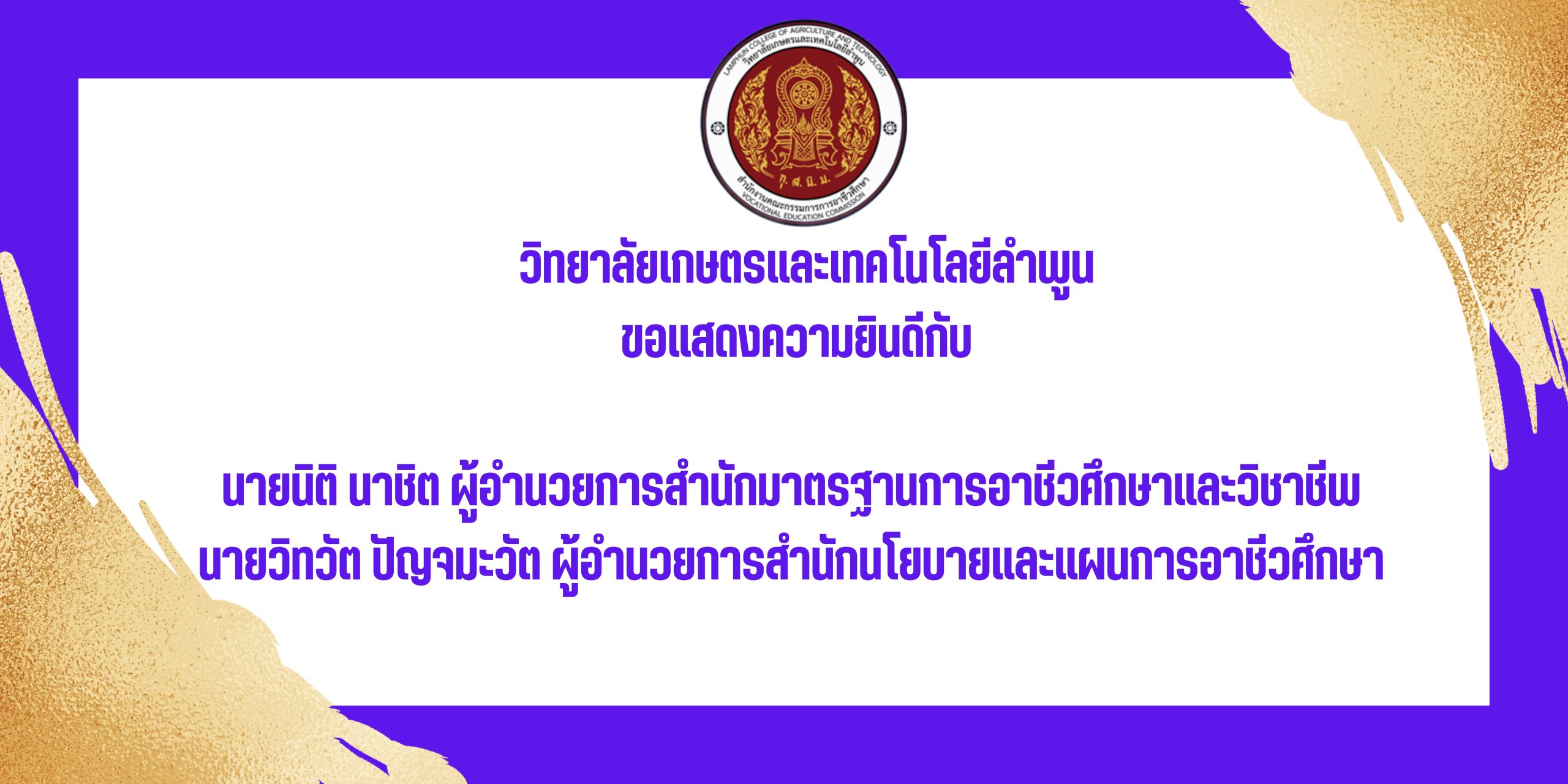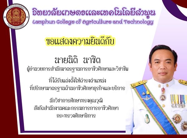 วิทยาลัยเกษตรและเทคโนโลยีลำพูนขอแสดงความยินดี กับ นายนิติ นาชิต ผู้อำนวยการสำนักมาตรฐานการอาชีวศึกษาและวิชาชีพ ที่ได้รับแต่งตั้งให้ดำรงตำแหน่ง ที่ปรึกษามาตรฐานด้านอาชีวศึกษาธุรกิจและบริการ นักวิชาการศึกษาทรงคุณวุฒิ สังกัดสำนักงานคณะกรรมการการอาชีวศึกษา กระทรวงศึกษาธิการ