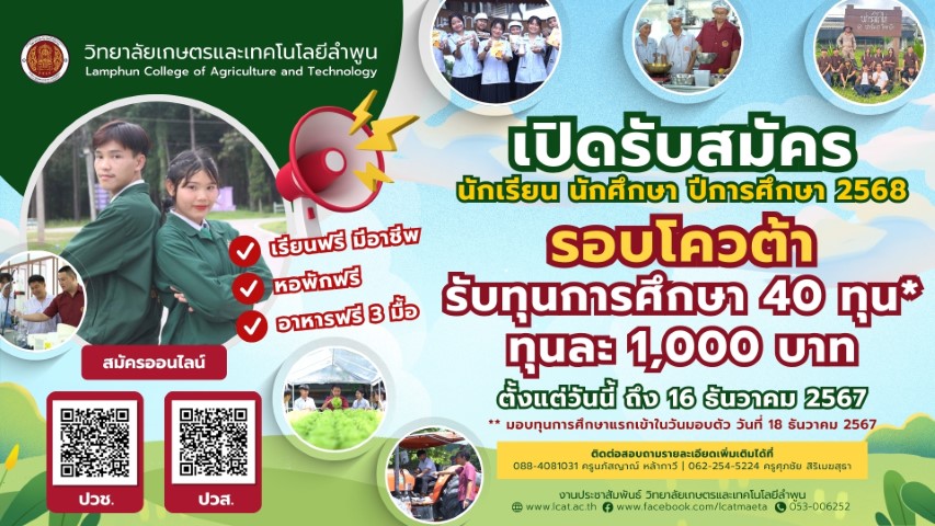 วิทยาลัยเกษตรและเทคโนโลยีลำพูน เปิดรับสมัครนักเรียน นักศึกษาใหม่ ประจำปีการศึกษา 2568