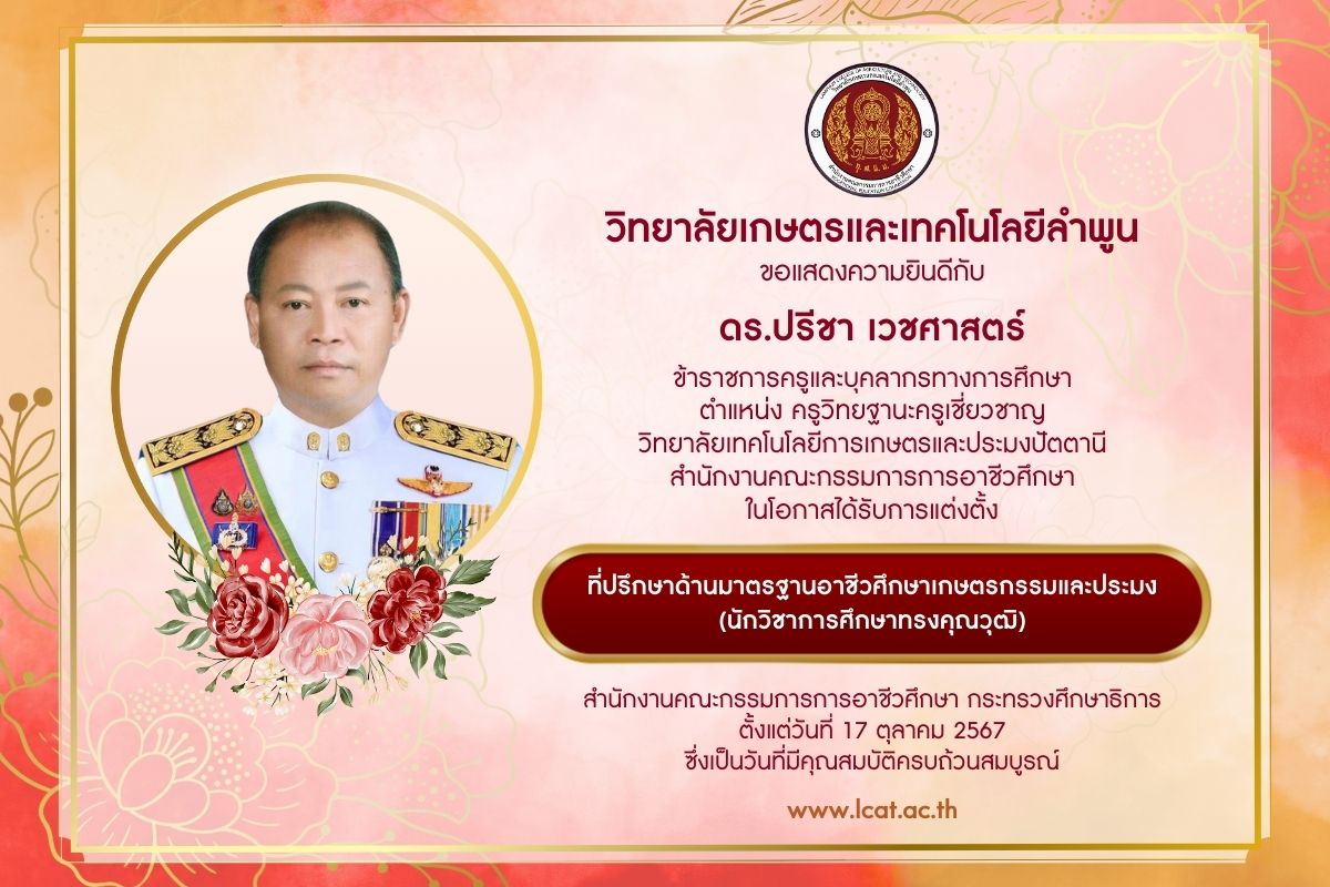 วิทยาลัยเกษตรและเทคโนโลยีลำพูน ขอแสดงความยินดี กับ ดร.ปรีชา เวชศาสตร์ ในโอกาสได้รับการแต่งตั้งดำรงตำแหน่ง ที่ปรึกษาด้านมาตรฐานอาชีวศึกษาเกษตรกรรมและประมง