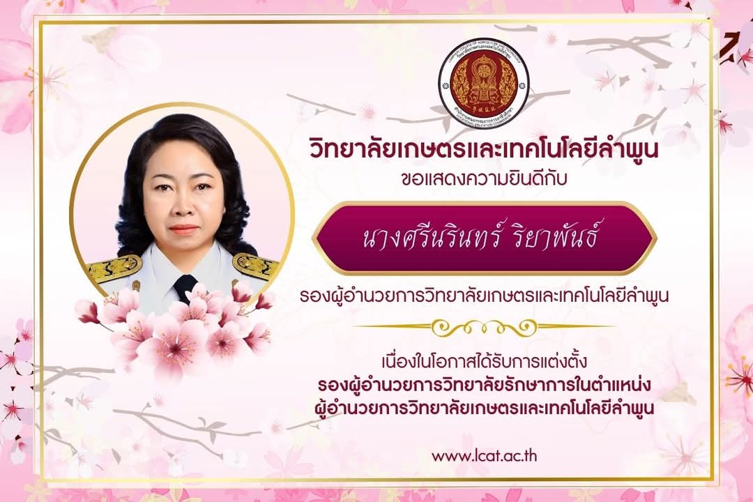 วิทยาลัยเกษตรและเทคโนโลยีลำพูน ขอแสดงความยินดีกับนางศรีนรินทร์ ริยาพันธ์รองผู้อำนวยการวิทยาลัยเกษตรและเทคโนโลยีลำพูน