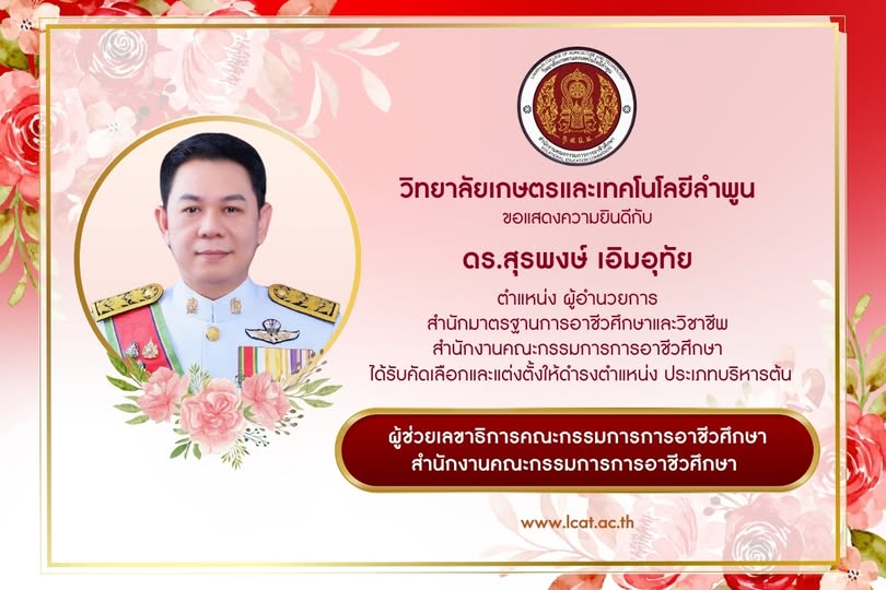 วิทยาลัยเกษตรและเทคโนโลยีลำพูน ขอแสดงความยินดีอย่างยิ่งกับ ดร.สุรพงษ์ เอิมอุทัย ได้รับคัดเลือกและแต่งตั้งให้ดำรงตำแหน่ง ผู้ช่วยเลขาธิการคณะกรรมการการอาชีวศึกษา