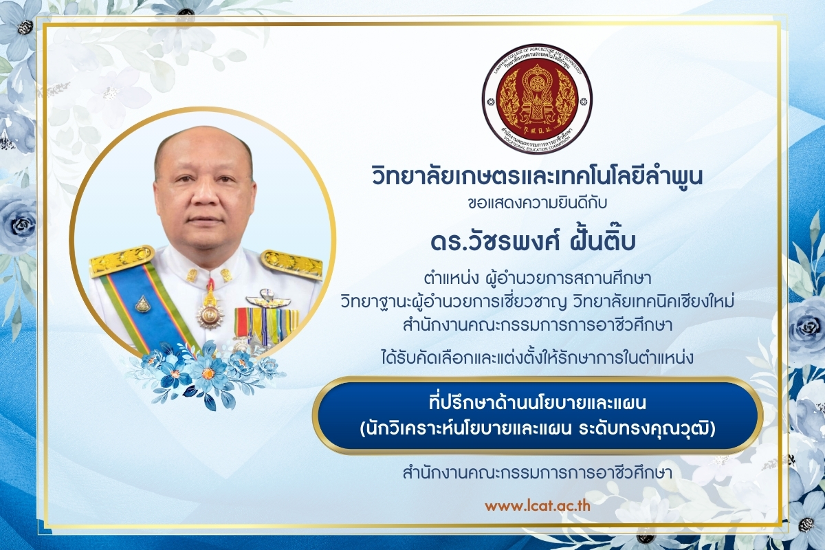 วิทยาลัยเกษตรและเทคโนโลยีลำพูน ขอแสดงความยินดีกับ ดร.วัชรพงศ์ ฝั้นติ๊บ ผู้อำนวยการวิทยาลัยเทคนิคเชียงใหม่ ปฏิบัติหน้าที่ผู้อำนวยการสำนักงานอาชีวศึกษาจังหวัดเชียงใหม่ ในโอกาสที่ได้รับแต่งตั้งให้ดำรงตำแหน่ง รักษาการในตำแหน่งที่ปรึกษาด้านนโยบายและแผน (นักวิเคราะห์นโยบายและแผน ระดับทรงคุณวุฒิ) สำนักงานคณะกรรมการการอาชีวศึกษา
