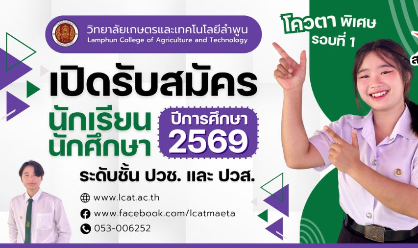 📢 วิทยาลัยเกษตรและเทคโนโลยีลำพูน เปิดรับสมัครนักเรียน นักศึกษาใหม่ ประจำปีการศึกษา 2569