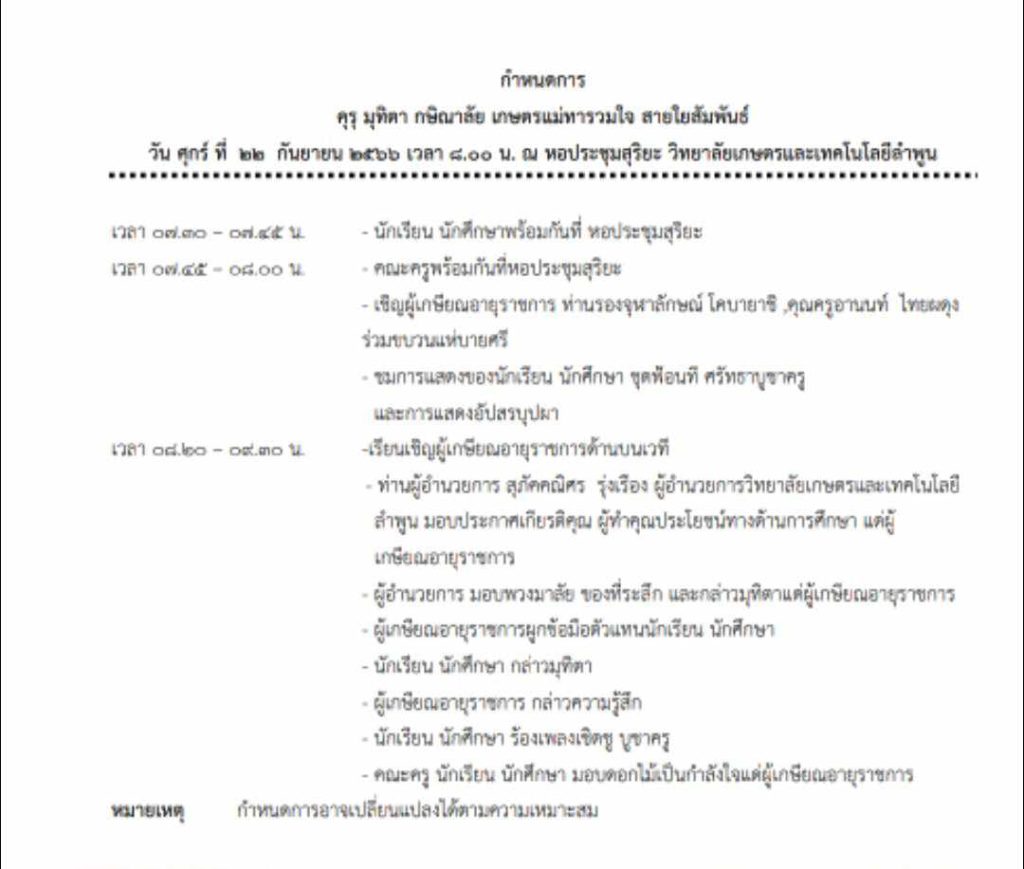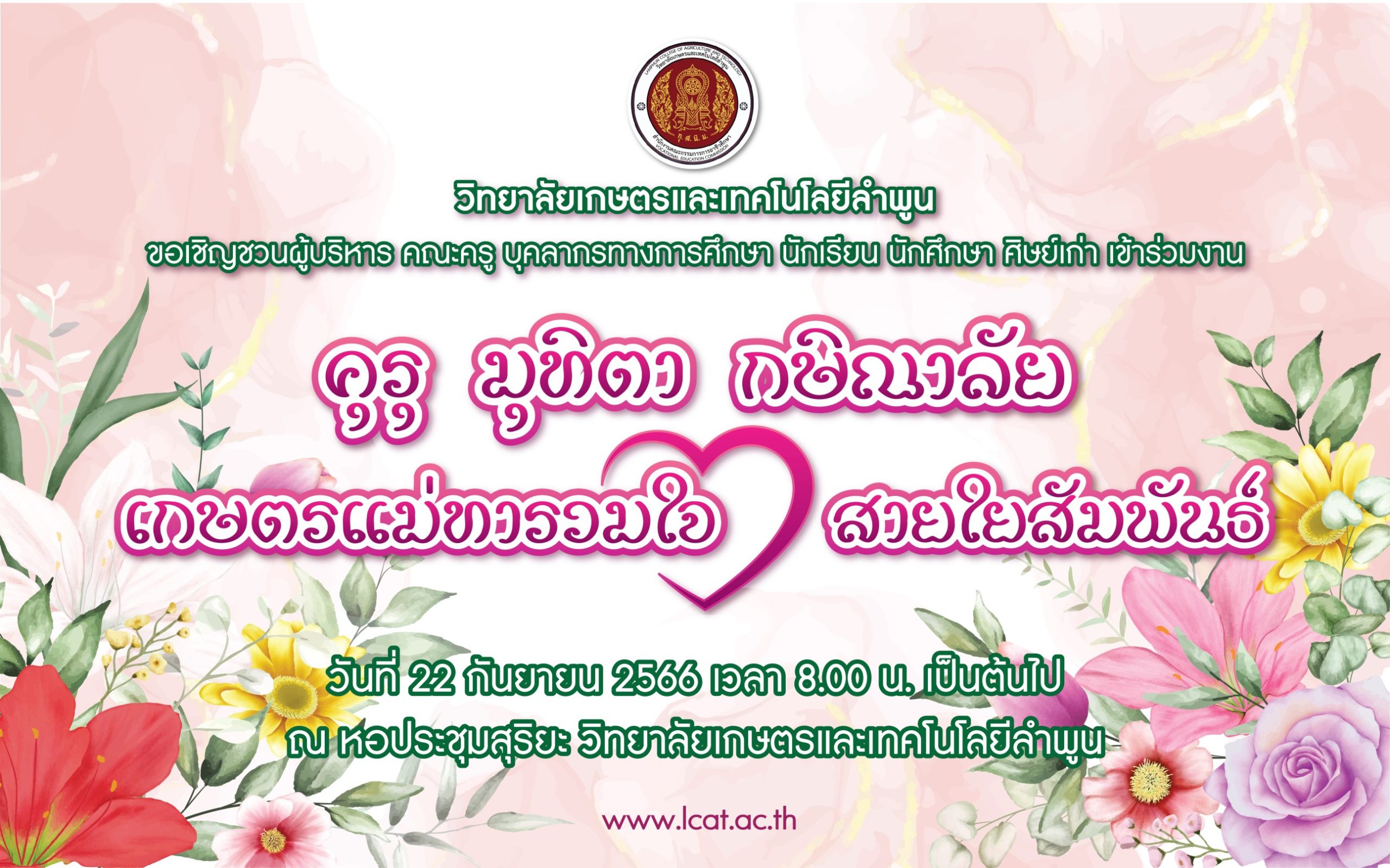 วิทยาลัยเกษตรและเทคโนโลยีลำพูน ขอเชิญชวนผู้บริหาร คณะครู บุคลากรทางการศึกษา นักเรียน นักศึกษา ศิษย์เก่า เข้าร่วมงาน คุรุ มุทิตา กษิณาลัยแด่ ครูอนนท์ ไทยผดุง