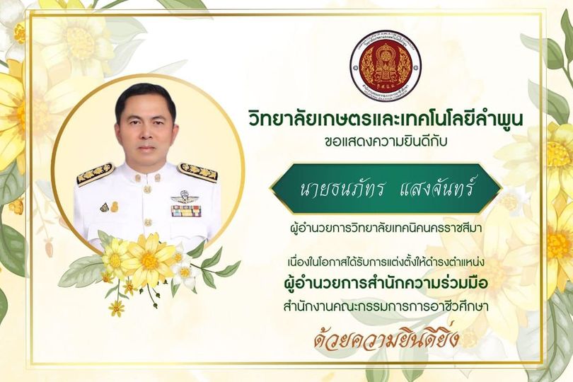 วิทยาลัยเกษตรและเทคโนโลยีลำพูน ขอแสดงความยินดีกับ นายธนภัทร แสงจันทร์ เนื่องในโอกาสได้รับการแต่งตั้งให้ดำรงตำแหน่งผู้อำนวยการสำนักความร่วมมือ สำนักงานคณะกรรมการการอาชีวศึกษาด้วยความยินดียิ่ง