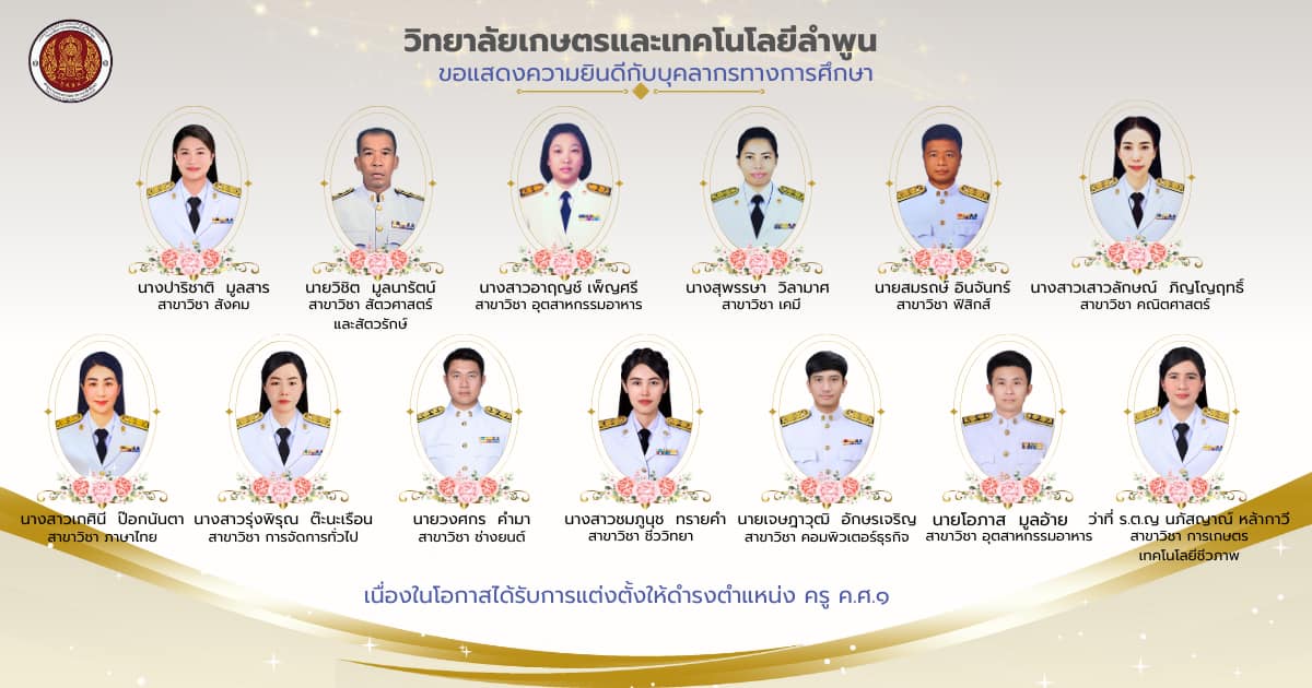 วิทยาลัยเกษตรและเทคโนโลยีลำพูน ขอแสดงความยินดีกับบุคลากรทางการศึกษา เนื่องในโอกาสได้รับการแต่งตั้งให้ดำรงตำแหน่ง ครู ค.ศ.1 จำนวน 13 คน