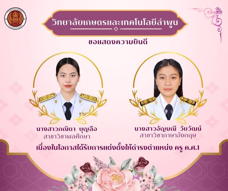 วิทยาลัยเกษตรและเทคโนโลยีลำพูนขอแสดงความยินดีกับบุคลากรทางการศึกษา เนื่องในโอกาสได้รับการแต่งตั้งให้ดำรงตำแหน่ง ครู ค.ศ. จำนวน 2 ราย