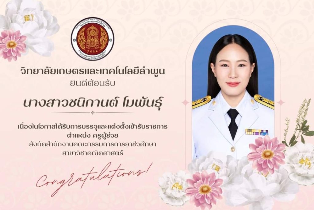 วิทยาลัยเกษตรและเทคโนโลยีลำพูน ยินดีต้อนรับ นางสาวชนิกานต์ โมพันธุ์ ครูผู้ช่วย แผนกวิชาสามัธสัมพันธ์ สาขาวิชาคณิตศาสตร์ ด้วยความยินดียิ่ง