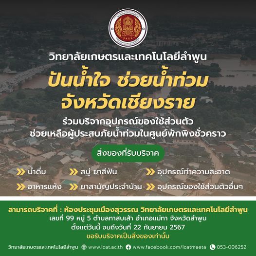 วิทยาลัยเกษตรและเทคโนโลยีลำพูน ร่วมปันน้ำใจ ช่วยน้ำท่วม จังหวัดเชียงราย ร่วมบริจาคอุปกรณ์ของใช้จำเป็นเพื่อช่วยเหลือผู้ประสบอุทกภัยน้ำท่วมพื้นที่จังหวัดเชียงราย