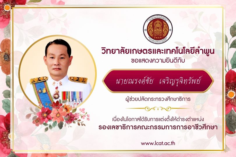 วิทยาลัยเกษตรและเทคโนโลยีลำพูน ขอแสดงความยินดีกับ นายณรงค์ชัย เจริญรุจิทรัพย์ ผู้ช่วยปลัดกระทรวงศึกษาธิการ เนื่องในโอกาสได้รับการแต่งตั้งให้ดำรงตำแหน่ง รองเลขาธิการคณะกรรมการการอาชีวศึกษา