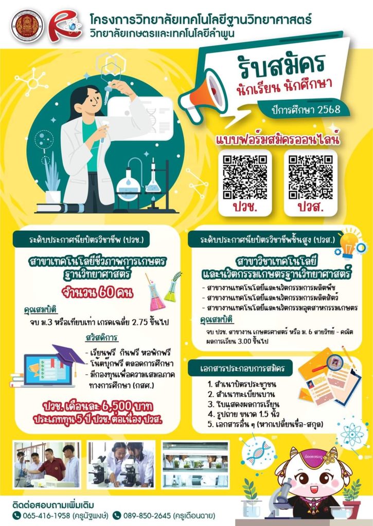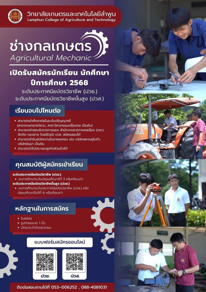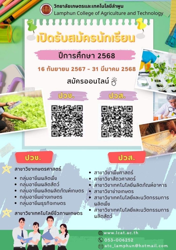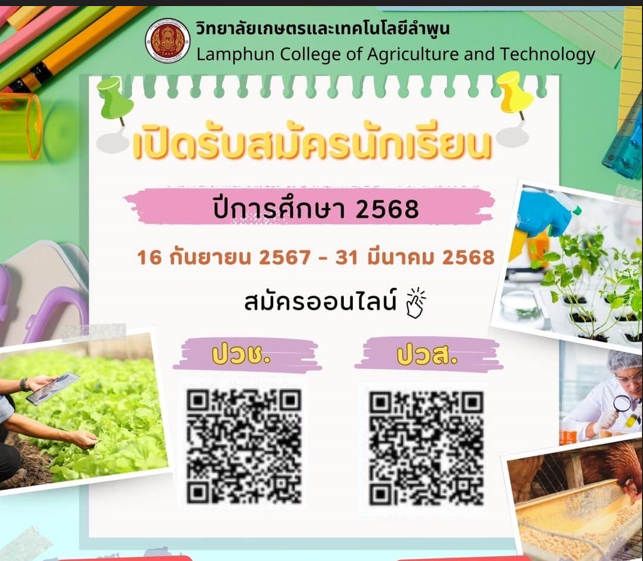 วิทยาลัยเกษตรและเทคโนโลยีลำพูน เปิดรับนักเรียน นักศึกษา เข้าศึกษาต่อในระดับ ปวช. และ ปวส. ปีการศึกษา 2568