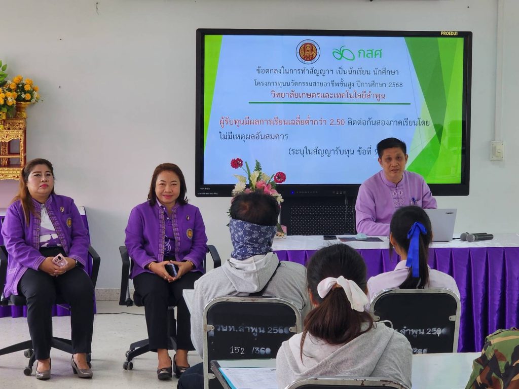 วันที่ 13 พฤษภาคม 2568 ดร.ธีรวุธ ยะอูป ผู้อำนวยการวิทยาลัยเกษตรและเทคโนโลยีลำพูน พร้อมด้วยคณะผู้บริหาร คณะครูแผนกเทคโนโลยีชีวภาพการเกษตรฐานวิทยาศาสตร์ และบุคลากรทางการศึกษา เข้าร่วมการปฐมนิเทศ ประชุมผู้ปกครอง และชี้แจงข้อตกลงการทำสัญญาฯ เป็นนักเรียน นักศึกษา กองทุนเพื่อความเสมอภาคทางการศึกษา (กสศ.) ประจำปีการศึกษา 2568 ณ อาคารอเนกประสงค์ วิทยาลัยเกษตรและเทคโนโลยีลำพูน