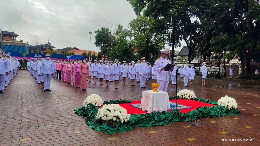 วันที่ 23 ตุลาคม 2566 เวลา 07.00 น. ดร.จักรกฤษณ์ ทิพเลิศ ผู้อำนวยการวิทยาลัยเกษตรและเทคโนโลยีลำพูน พร้อมด้วยคณะครู บุคลากร และนักเรียน นักศึกษา เข้าร่วมกิจกรรมน้อมรำลึกเนื่องในวันคล้ายวันสวรรคต พระบาทสมเด็จพระจุลจอมเกล้าเจ้าอยู่หัว เพื่อถวายความเคารพและน้อมรำลึกถึงพระมหากรุณาธิคุณของพระบาทสมเด็จพระจุลจอมเกล้าเจ้าอยู่หัว รัชกาลที่ 5 อันหาที่สุดมิได้ที่มีคุณูปการต่อพสกนิกรชาวไทย ณ พระบรมนุสาวรีย์พระบาทสมเด็จพระจุลจอมเกล้าเจ้าอยู่หัว ศาลากลางจังหวัดลำพูน (หลังเก่า) โดยมีนายสันติธร ยิ้มละมัย ผู้ว่าราชการจังหวัดลำพูน เป็นประธานในพิธี
