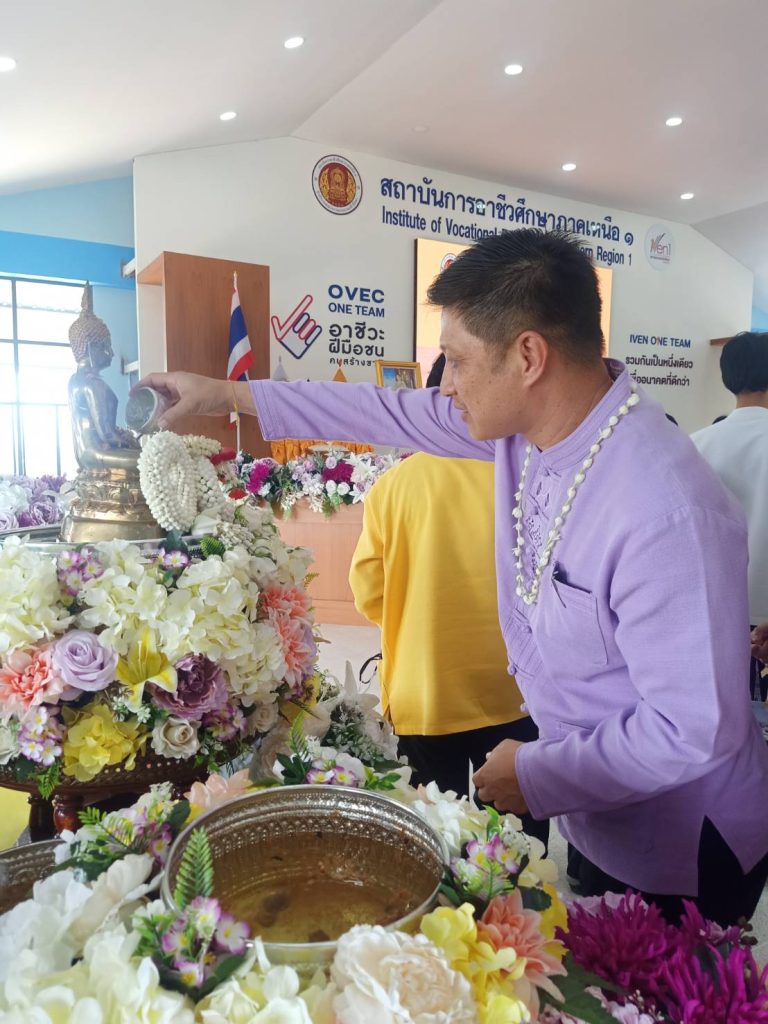 วันที่ 13 พฤษภาคม 2568 ดร.ธีรวุธ ยะอูป ผู้อำนวยการวิทยาลัยเกษตรและเทคโนโลยีลำพูน พร้อมด้วยคณะผู้บริหาร เข้าร่วมกิจกรรมรดน้ำดำหัวสืบสานป๋าเวณีปี๋ใหม่เมือง สถานบันการอาชีวศึกษาภาคเหนือ เพื่อสืบสานวัฒนธรรม ประเพณีอันดีงามของไทย และเป็นการอนุรักษ์วัฒนธรรม ภูมิปัญญาท้องถิ่นที่มีคุณค่าให้คงอยู่ ณ สถานบันการอาชีวศึกษาภาคเหนือ 1