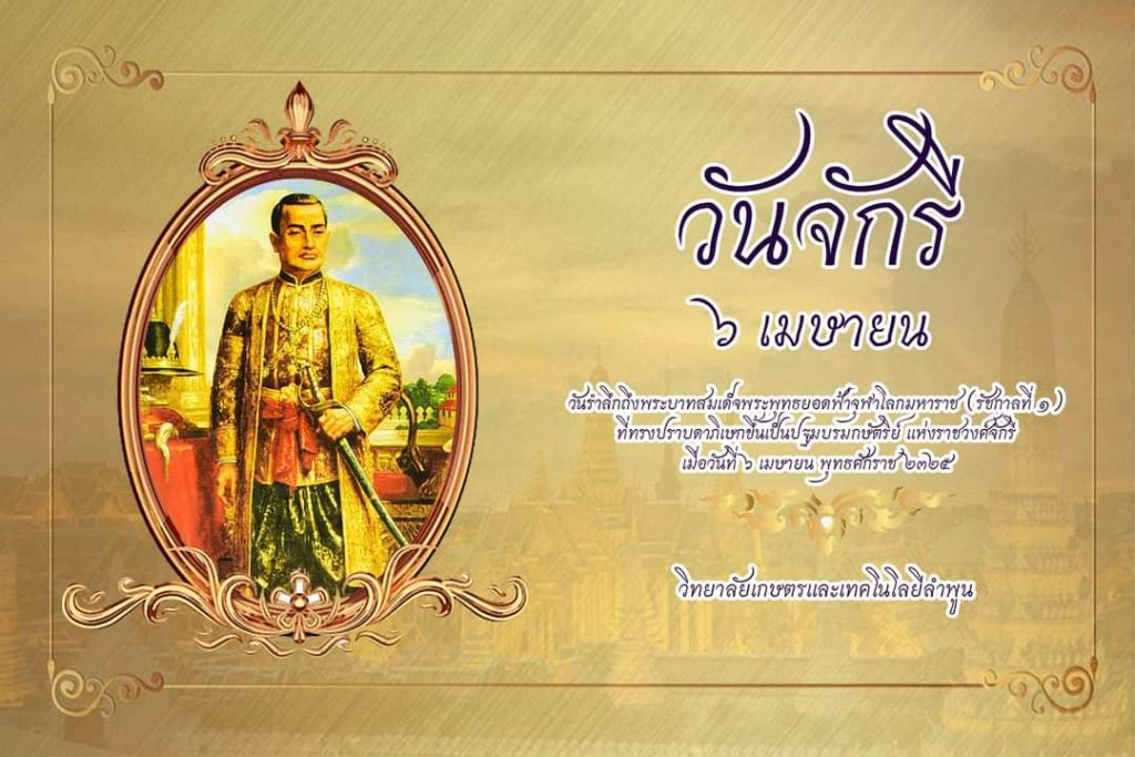 วันที่ 6 เมษายน 2566 ผู้อำนวยการวิทยาลัยเกษตรและเทคโนโลยีลำพูน มอบหมายให้นางจุฬาลักษณ์โคบายาชิ รองผู้อำนวยการฝ่ายพัฒนากิจการนักเรียน นักศึกษา พร้อมด้วยคณะครูเจ้าหน้าที่เข้าร่วมพิธีวางพานพุ่มถวายราชสักการะเนื่องในวันจักรี เพื่อระลึกถึงพระมหากรุณาธิคุณพระบาทสมเด็จพระพุทธยอดฟ้าจุฬาโลกมหาราช ณ หอประชุมอำเภอแม่ทา อำเภอแม่ทา จังหวัดลำพูน เนื่องในวันจักรีเพื่อระลึกถึงพระมหากรุณาธิคุณพระบาทสมเด็จพระพุทธยอดฟ้าจุฬาโลกมหาราช และมหาจักรีบรมราชวงศ์ทั้งนี้ วันจักรี ถือเป็นวันสำคัญอีกวันหนึ่งของไทย โดยเมื่อวันที่ 6 เมษายน พ.ศ.2325 เป็นวันที่ พระบาทสมเด็จพระพุทธยอดฟ้าจุฬาโลกมหาราชเสด็จปราบดาภิเษก ขึ้นครองราชย์เป็นกษัตริย์แห่งราชวงศ์จักรี และทรงสร้างกรุงเทพฯ เป็นเมืองหลวงของไทยมาจนทุกวันนี้