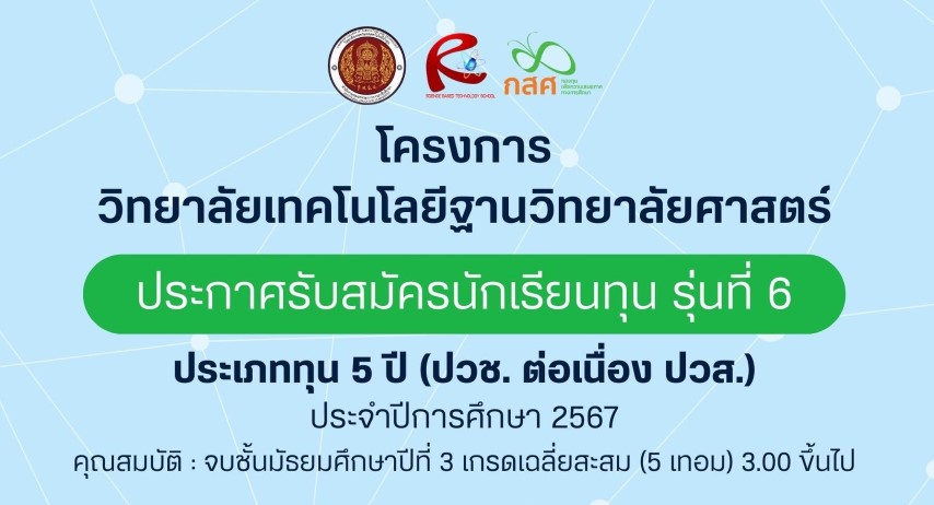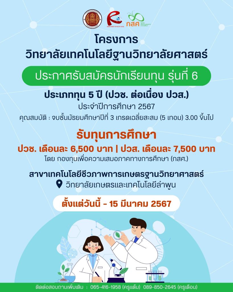 เปิดรับสมัครนักเรียนทุน กสศ. รุ่นที่ 6 ประเภททุน 5 ปี (ปวช. ต่อเนื่อง ปวส.) ปีการศึกษา 2567 โครงการวิทยาลัยเทคโนโลยีฐานวิทยาศาสตร์ สาขาเทคโนโลยีชีวภาพการเกษตรฐานวิทยาศาสตร์